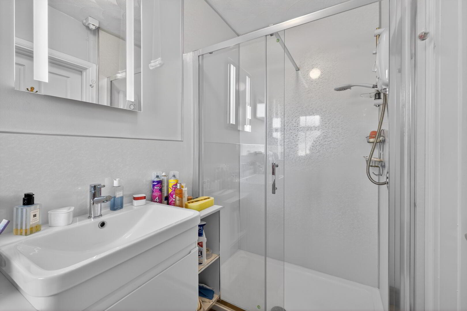 Comprising full wall length shower cubicle with Triton electric shower unit, marine boarding, vanity unit with counter top basin, mixer tap and drawer below, wall mounted mirror with lighting, low flush wc, half panelled marine boarded walls