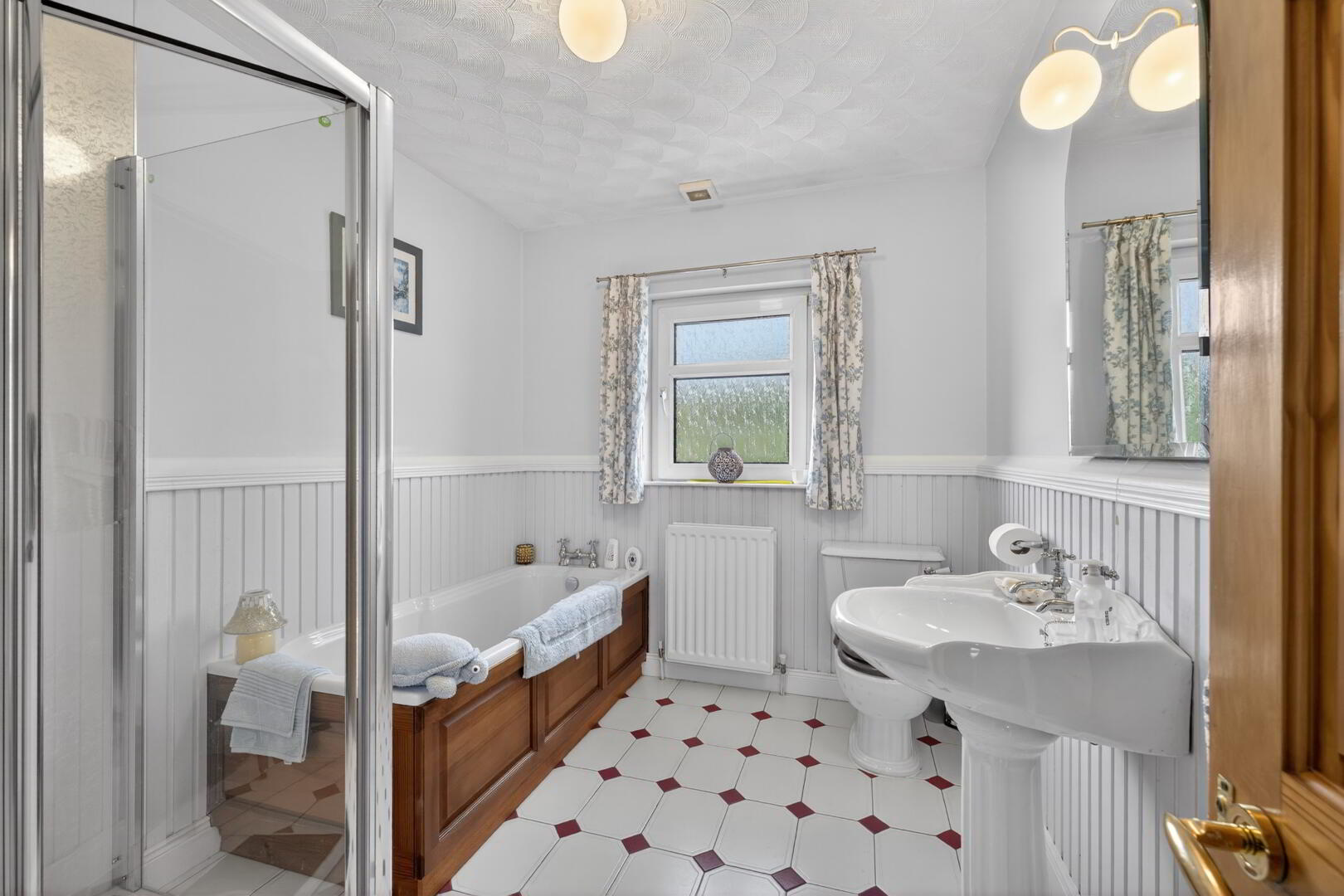 Triton shower unit, marine boarding, panelled bath with mixer tap, pedestal wash hand basin with mixer tap, wall mounted mirror and light above, low flush wc, wainscotting, tiled flooring