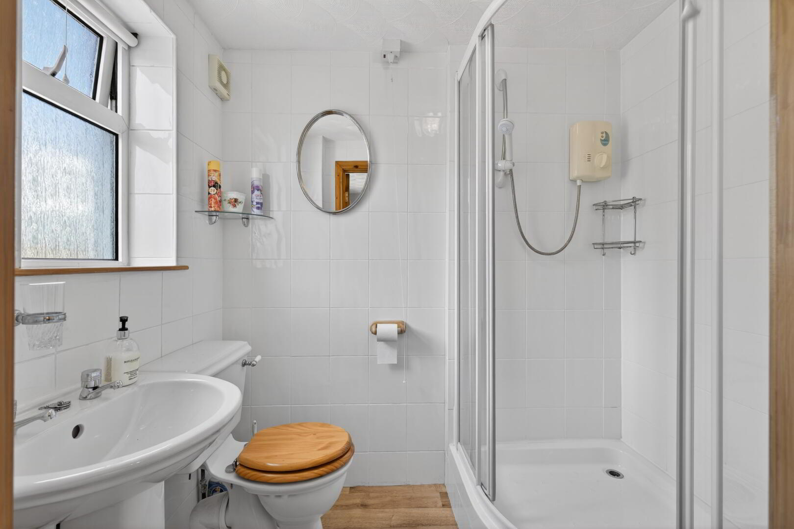 With fully tiled walls and comprising corner aspect shower cubicle with Gainsborough Impulse 9.5kw shower unit, pedestal wash hand basin, low flush wc