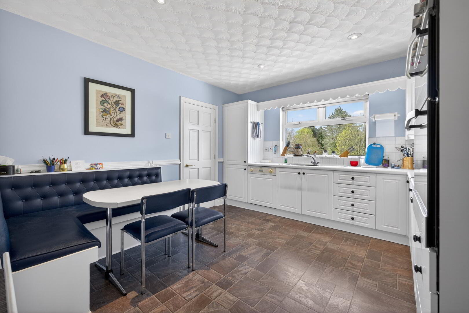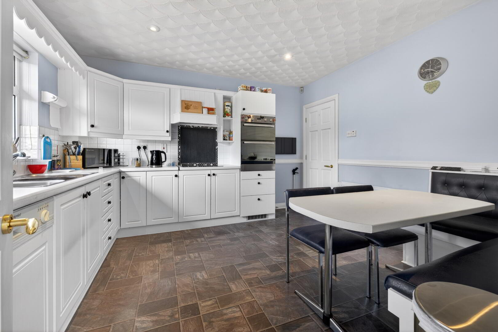 Fitted kitchen including Hotpoint eye level fan assisted oven and grill and separate grill, Blanco 4 ring glass plate electric hob, canopy above with integrated extractor, integrated Hotpoint dishwasher, 1 1/2 bowl sink unit and mixer tap, pelmet above with concealed lighting, partly tiled, corner aspect seating area, dado rail,telephone point, integrated spotlights, tiled flooring extending through