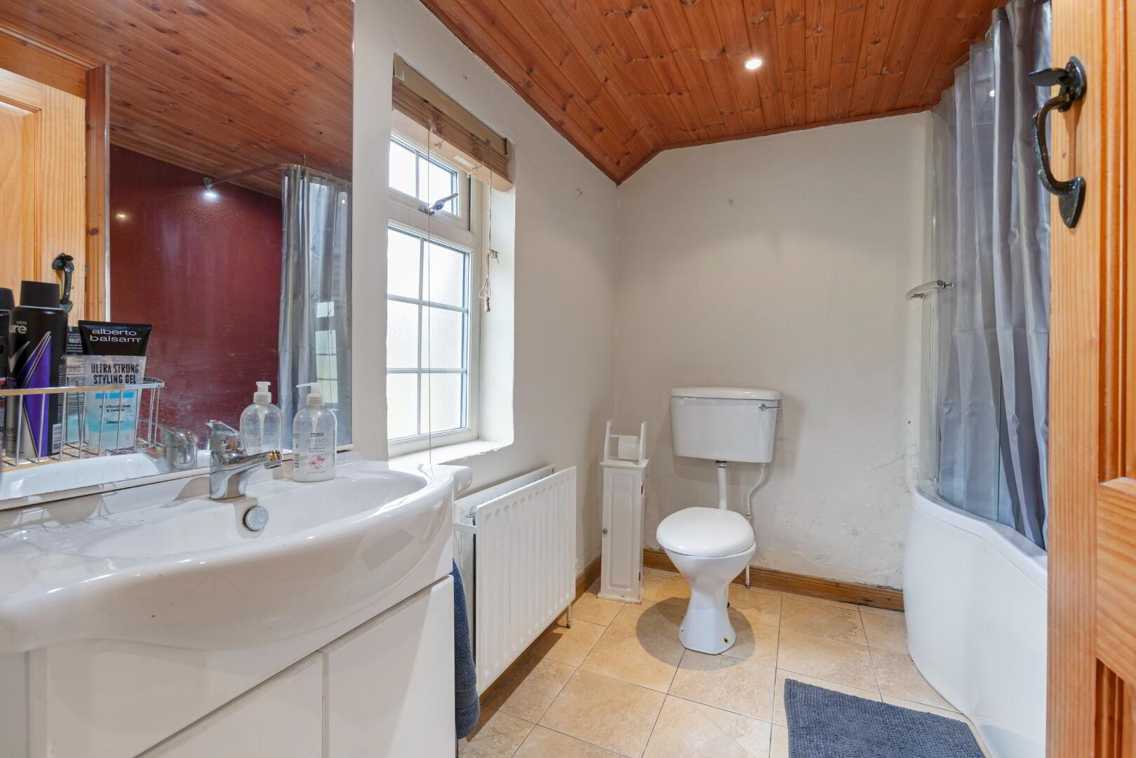 Comprising panelled bath with PVC panelled surround, mixer tap, Triton shower unit over, vanity unit and mixer tap, fitted mirror, low flush wc, tiled flooring, hot press, panelled ceiling with integrated spotlights