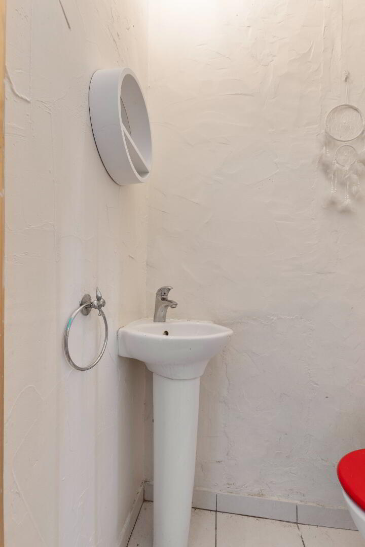 Comprising low flush wc, corner pedestal wash hand basin, tiled flooring