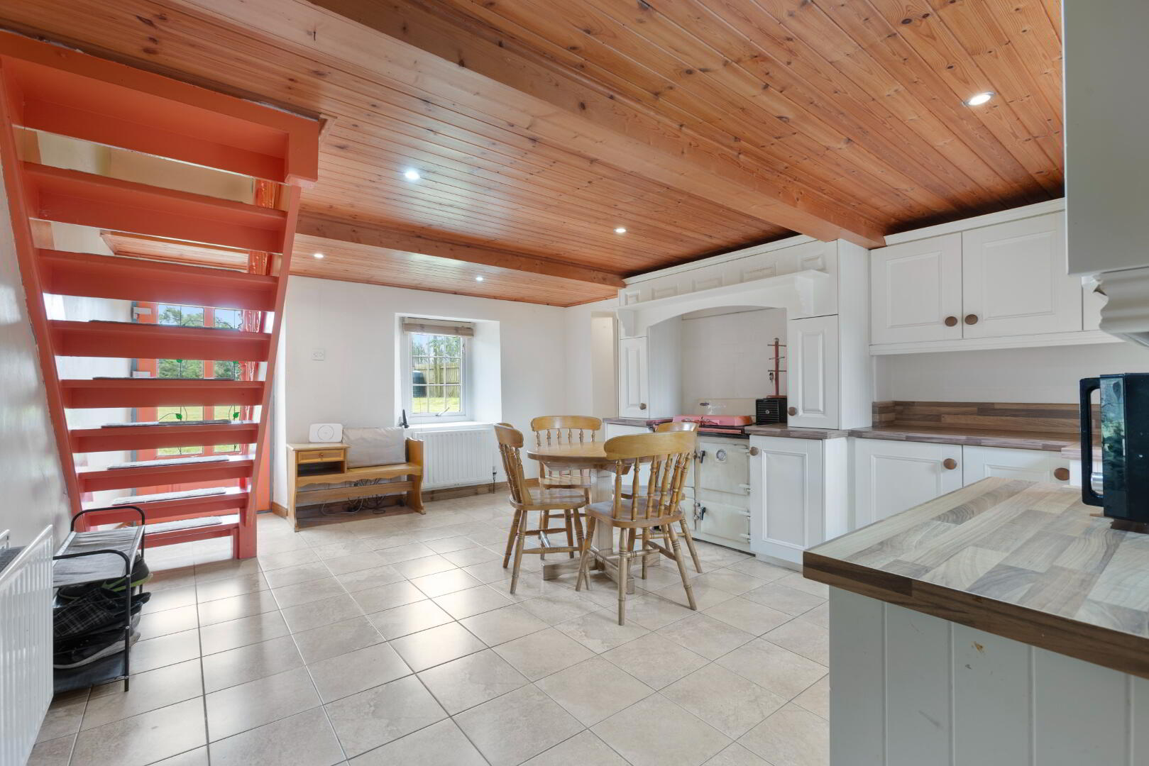 With range of fitted cabinetry, wood block effect worktops and upstands, inglenook with Rayburn Royal (not linked up), internet point, tiled flooring, panelled and boarded ceiling with integrated spotlights