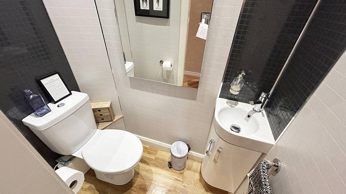 Amtico floor, low flush WC and vanity unit wash hand basin.