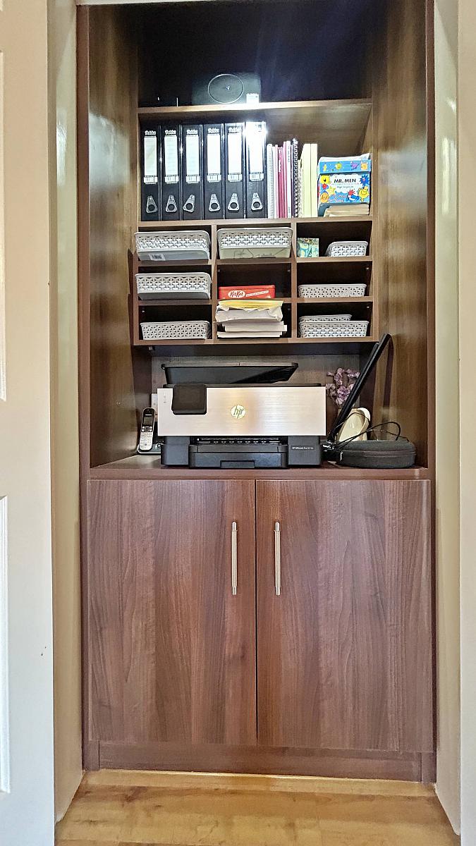 Amtico floor with bespoke office storage cupboard. Further storage cupboard, shelved hot press.