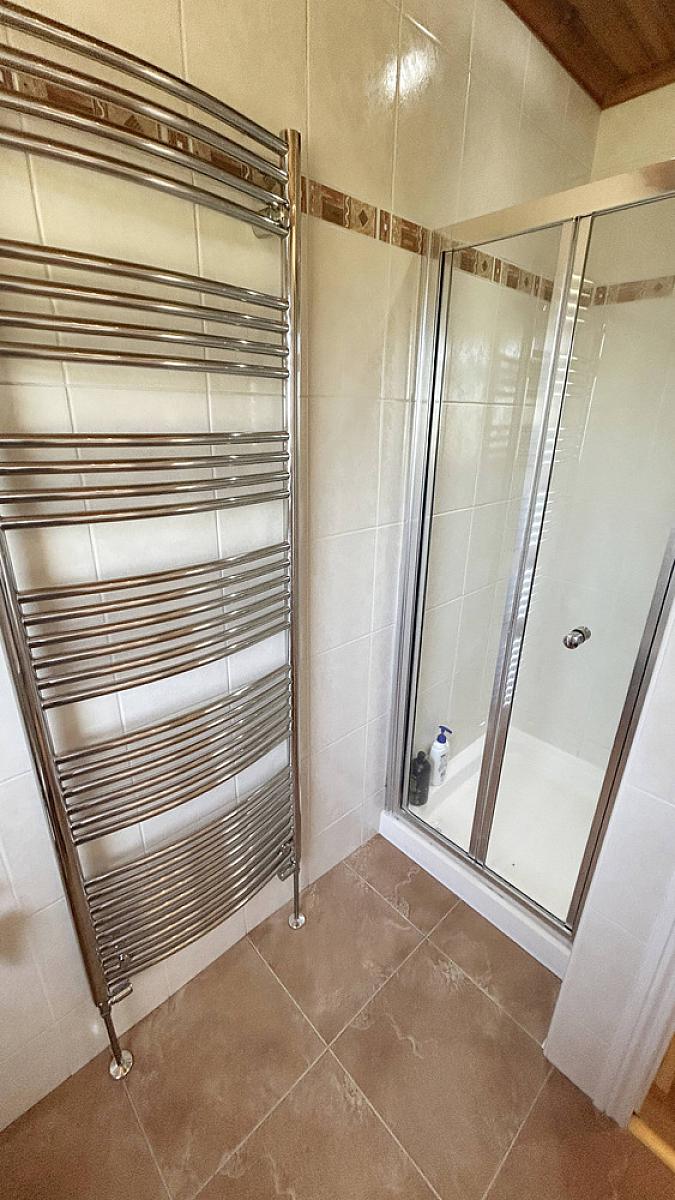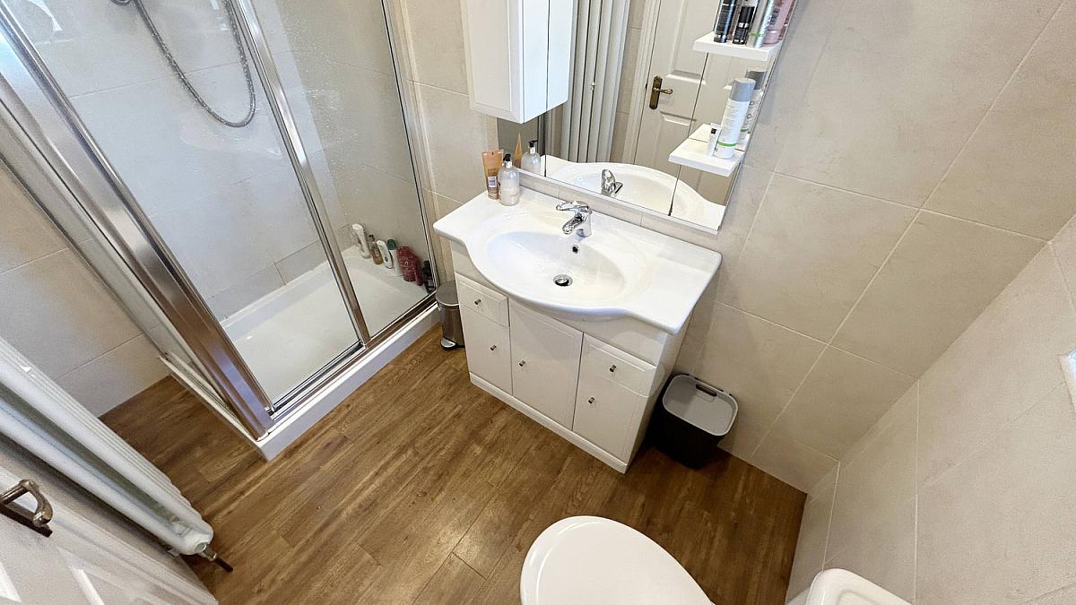 Fully tiled walls and shower cubicle with mains shower. Low flush WC and vanity unity wash hand basin.