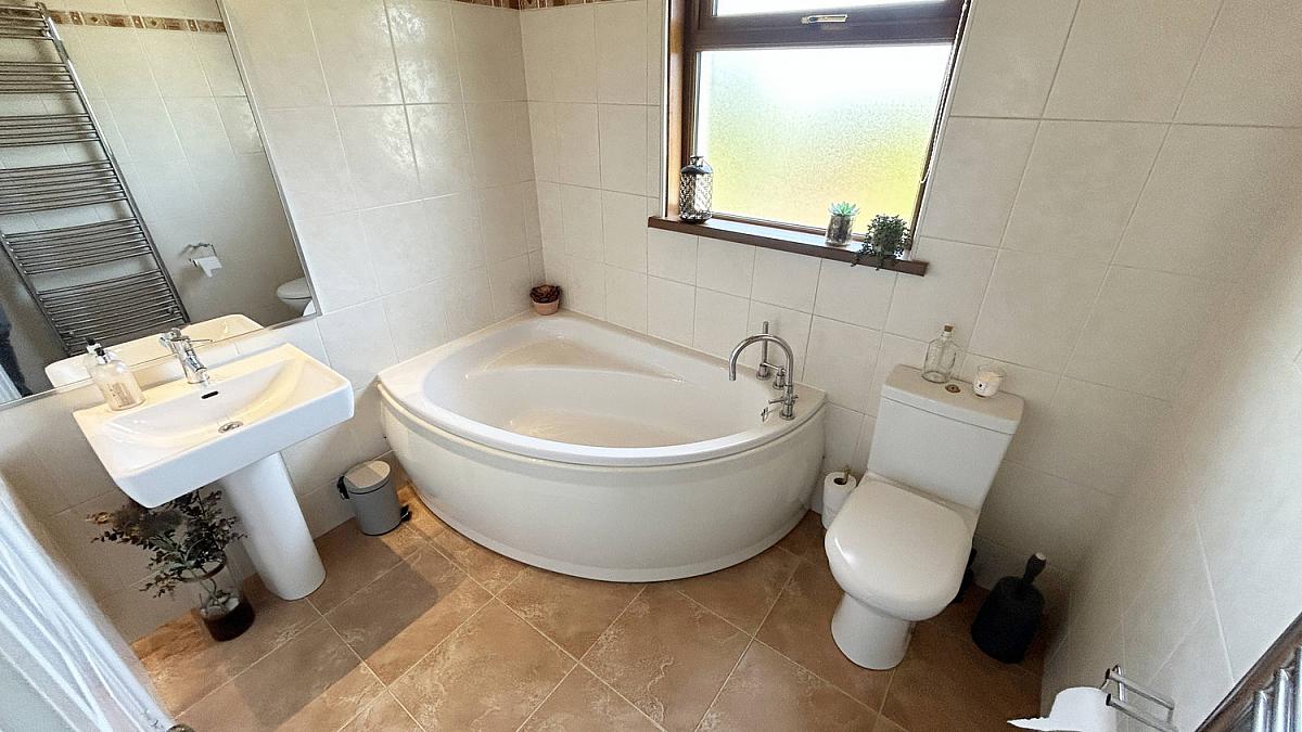 Karndean floor with fully tiled walls. Corner bath and shower cubicle with mains shower. Low flush WC and pedestal wash hand basin.