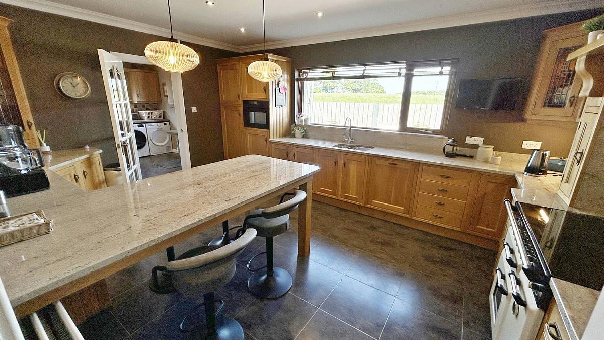 High and low level storage units with solid wood doors and granite worktops. Integrated dishwasher, integrated fridge and integrated oven and microwave. Space for range style cooker. Views over countryside.