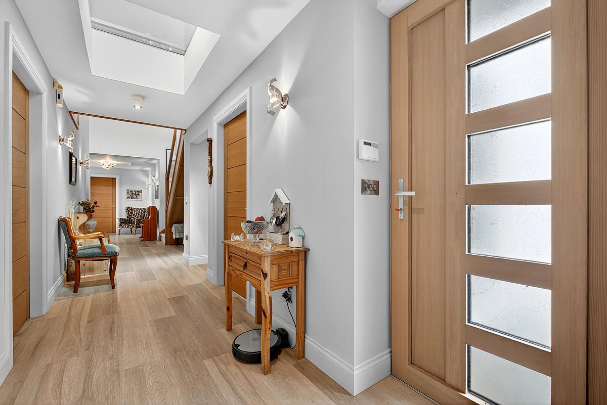 Glass panel composite front door and Karndean flooring. Glass staircase to first floor and light well.