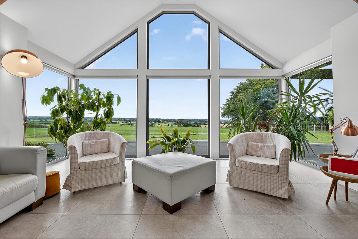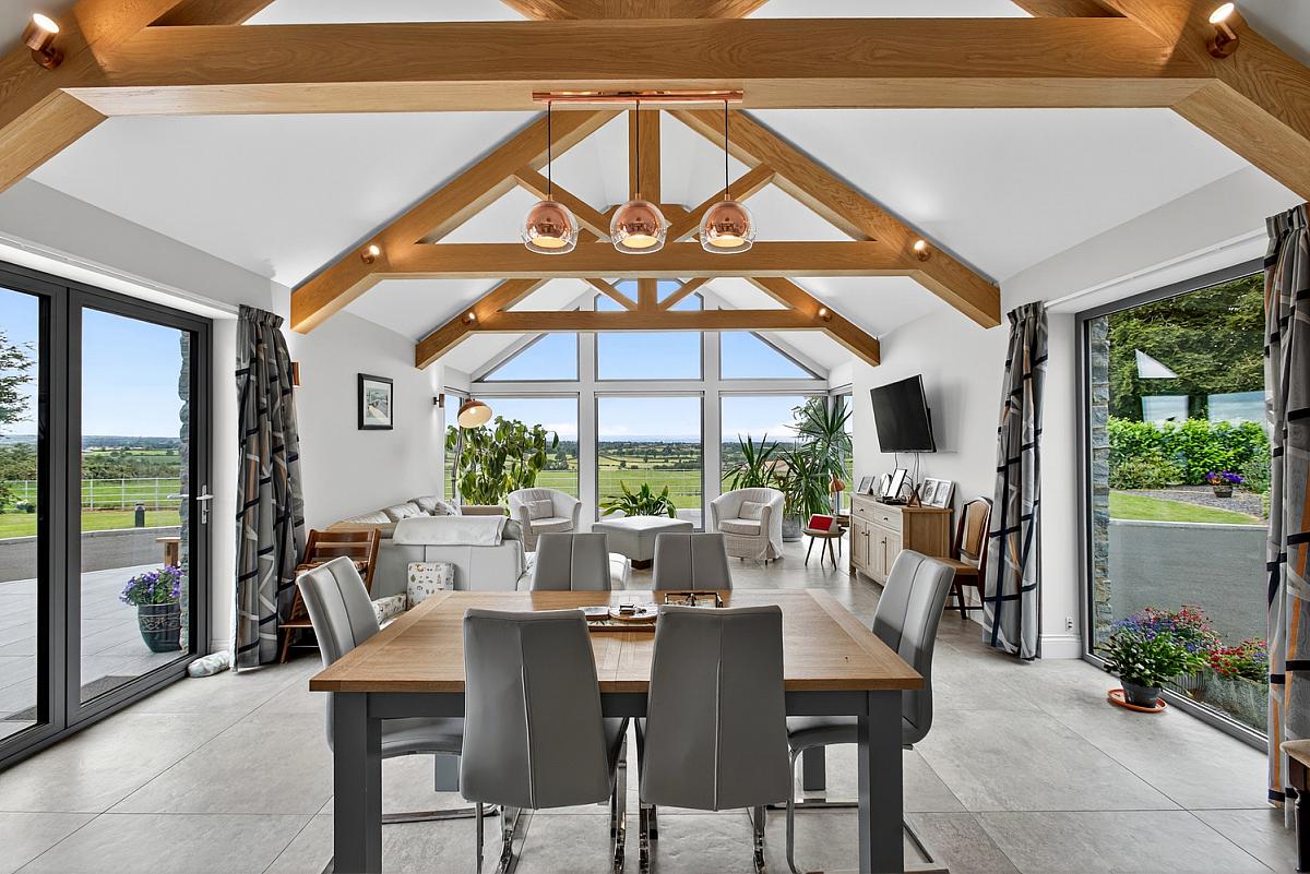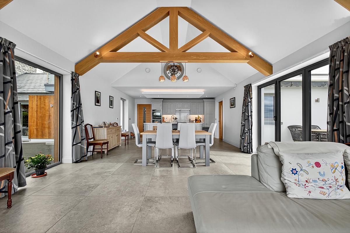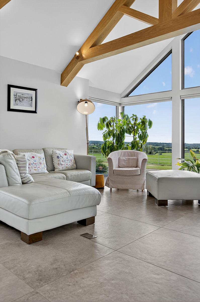 FAMILY ROOM - Triple aspect with stunning views over the countryside and toward the Sperrins. Exposed beam and vaulted ceiling. Television point and Bi folding doors to side garden.