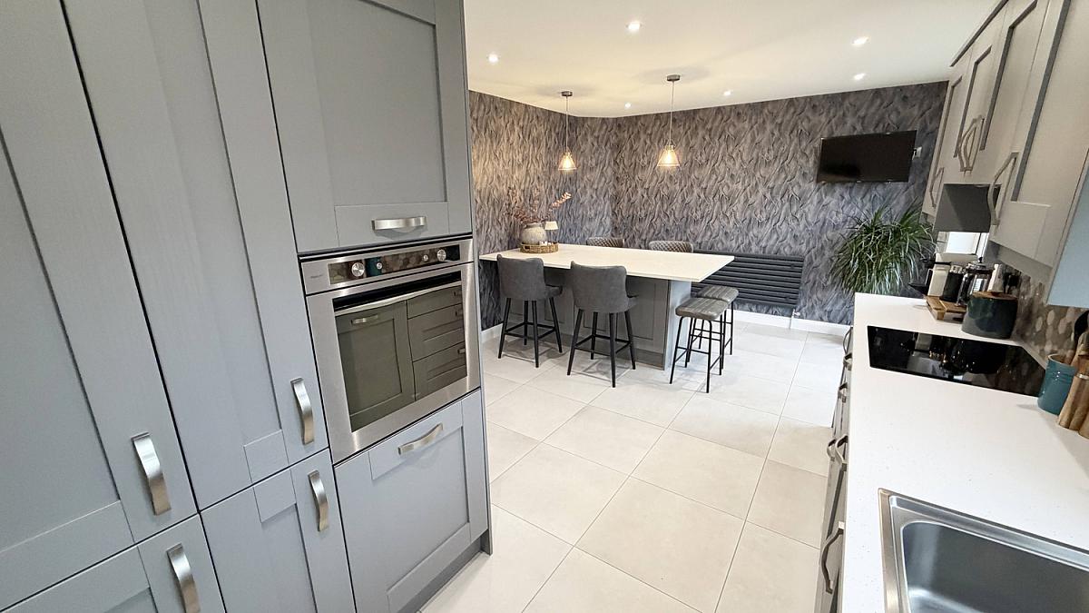 Breakfast bar/island with storage and quartz top. Television point, recessed lighting, patio doors to the rear garden.
