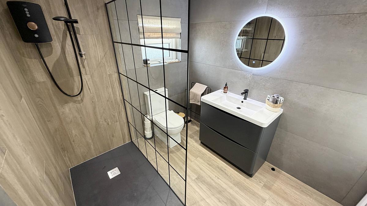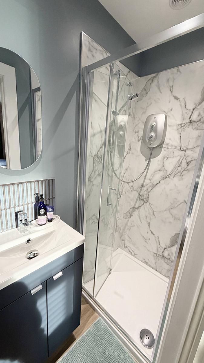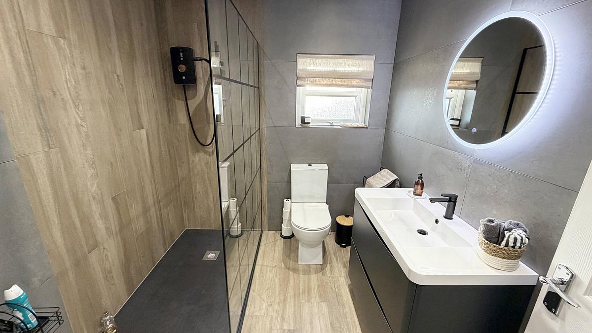 Walk in shower enclosure, low flush WC, wash hand basin vanity unit, heated towel rail, LED mirror
