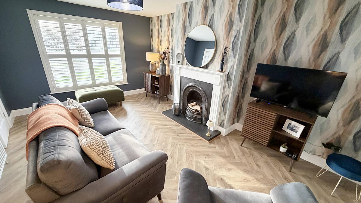 LVT flooring, television point, open fire with tiled hearth and wood surround.