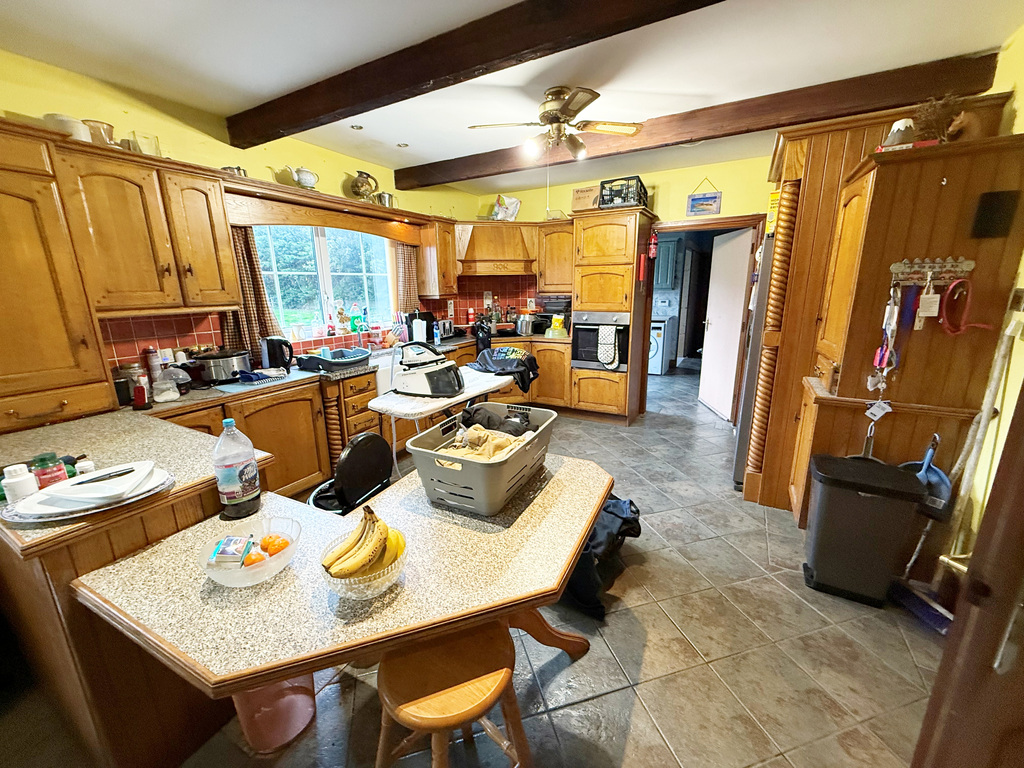 Tiled floor and part tiled walls. Fitted kitchen with Belfast sink and some integrated appliances.