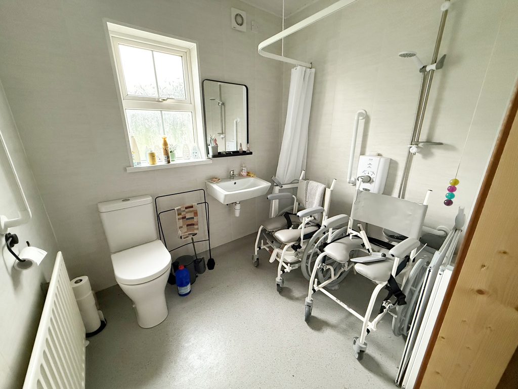 Comprising, Free standing bath with shower attachment. Electric shower cubicle with PVC panelling. Low flush WC, wash hand basin. Tiled floor.