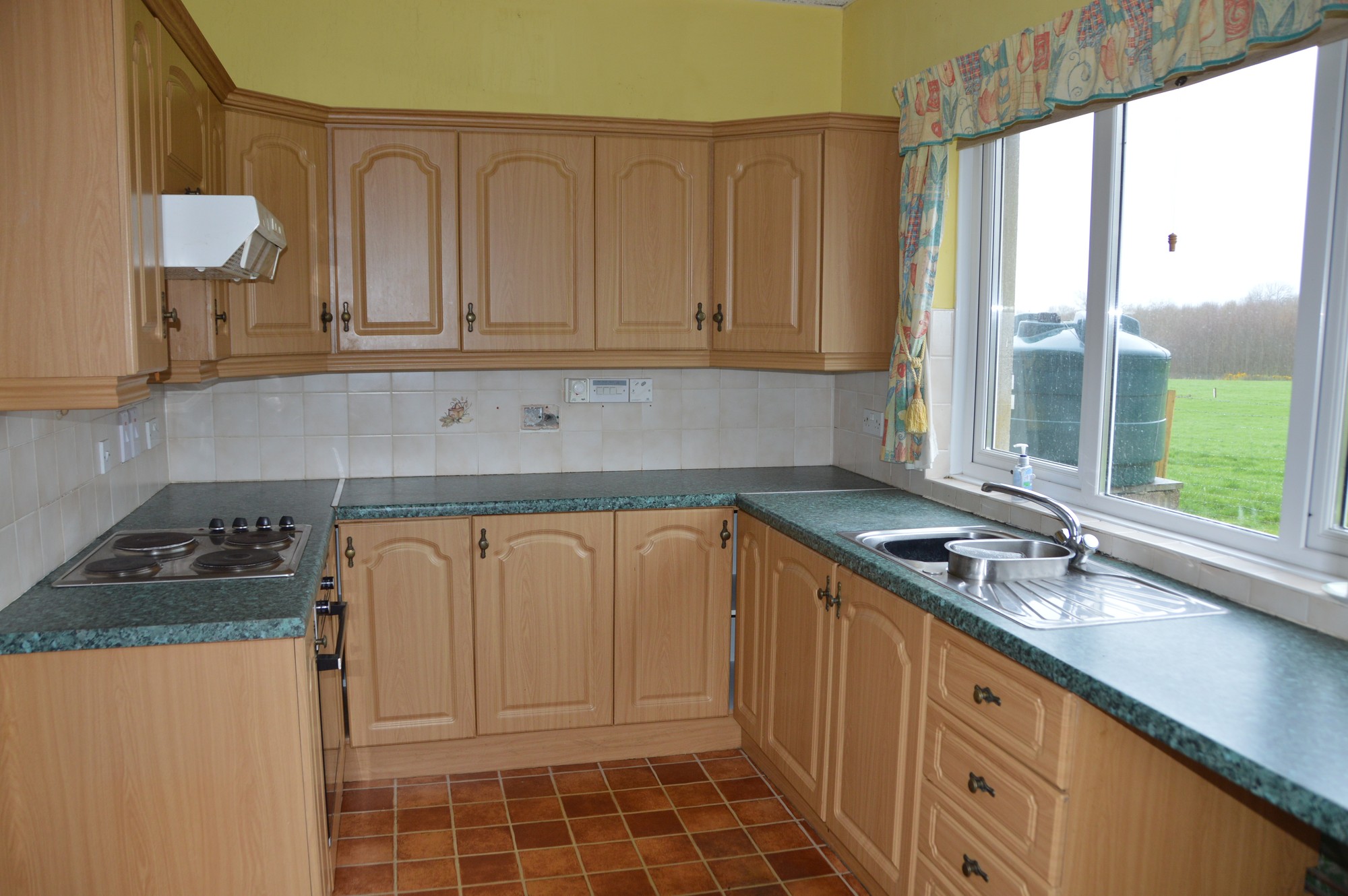 Rear external door, 1 ½ bowl stainless steel sink unit and drainer, integral hob, Zanussi oven, range of high and low level units, ½ tiled walls space for washing machine, tumble dryer, double radiator. Second staircase to landing.