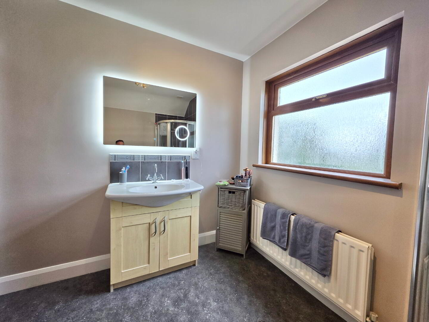 8'11 x 8'0 With white suite, feature corner bath, telephone hand shower attachment on bath, fully tiled walk-in shower cubicle having 'Triton' T80 electric shower system, vanity unit, fitted wall mirror with LED light.