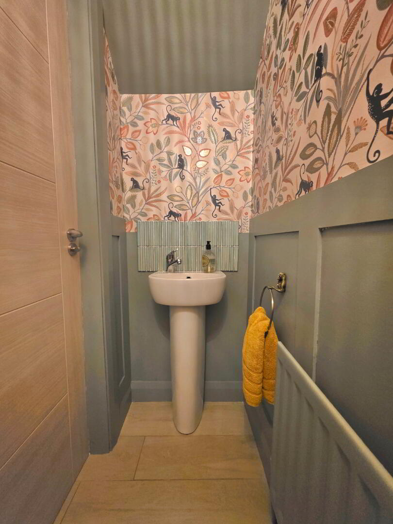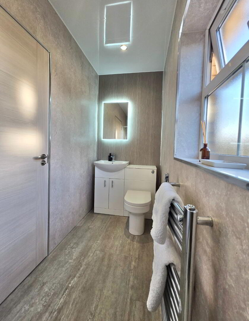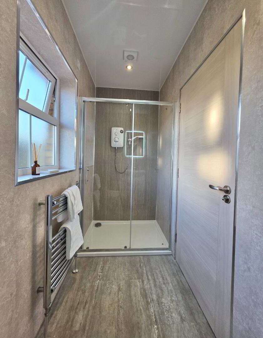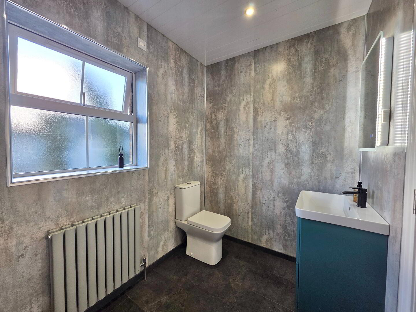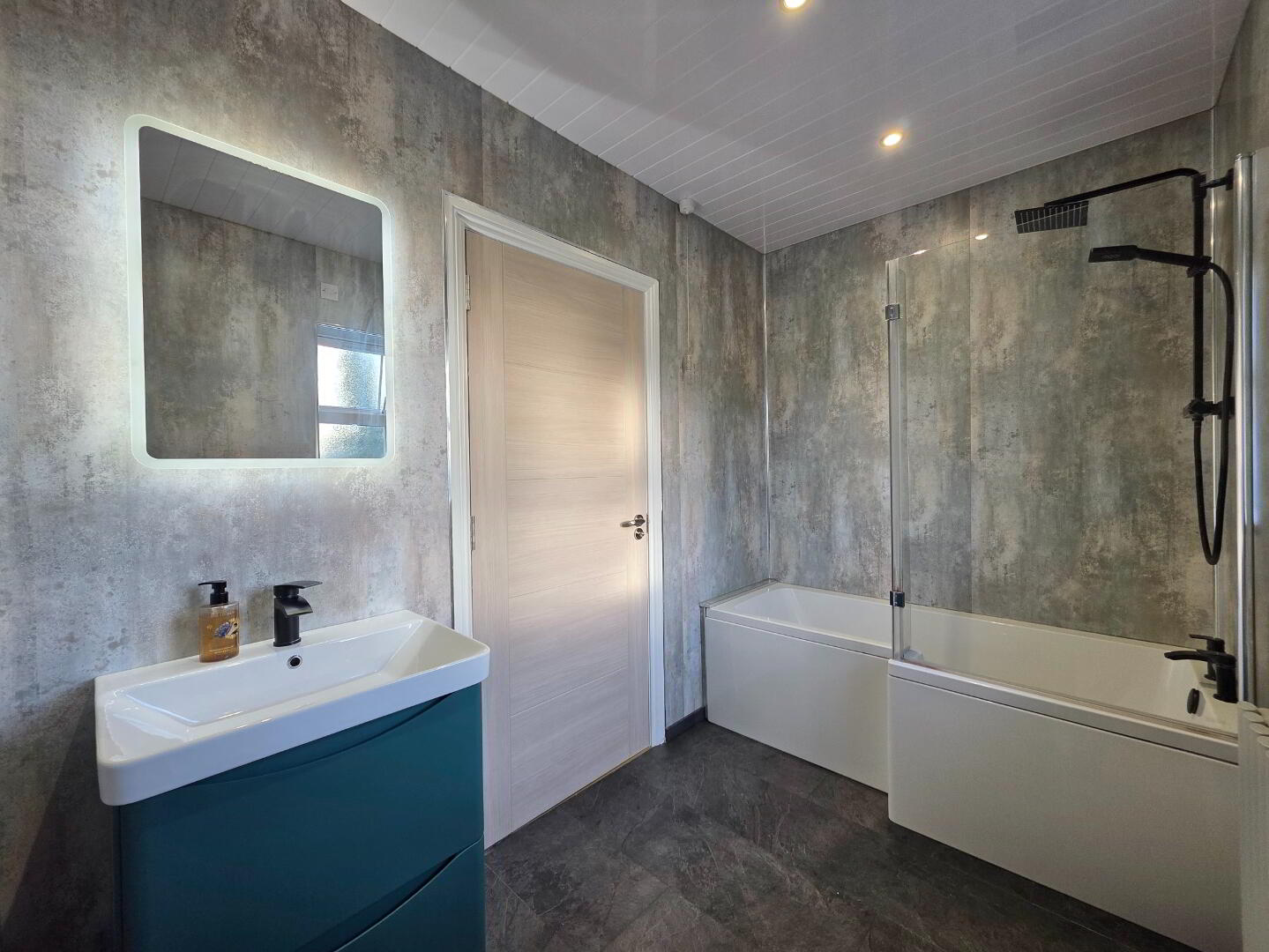 9'3 x 6'2 With white suite, combi bath with fitted shower screen, thermostatic shower over bath complete with drench head and body spray, vanity unit, fully cladded walls, tiled floor.