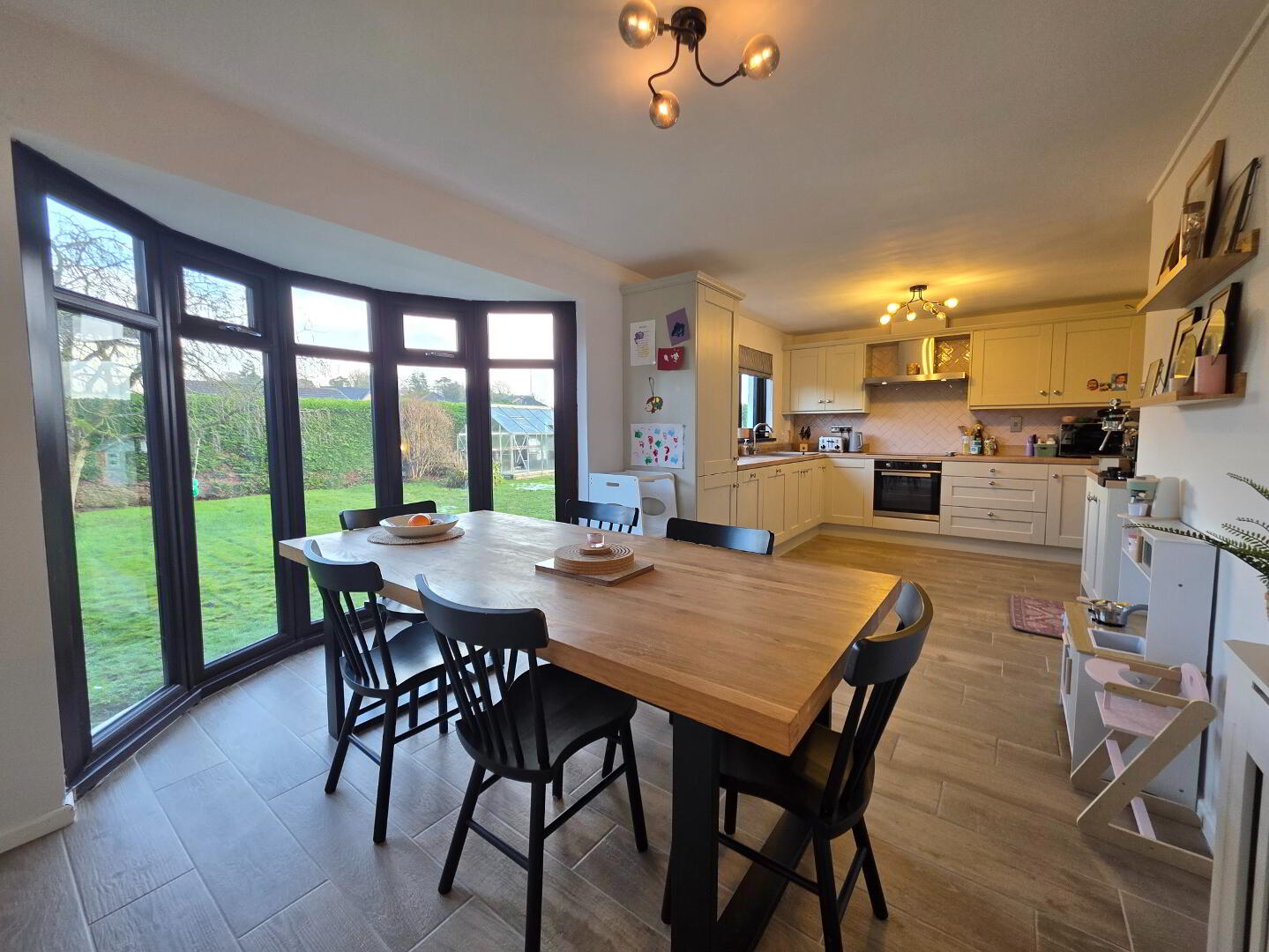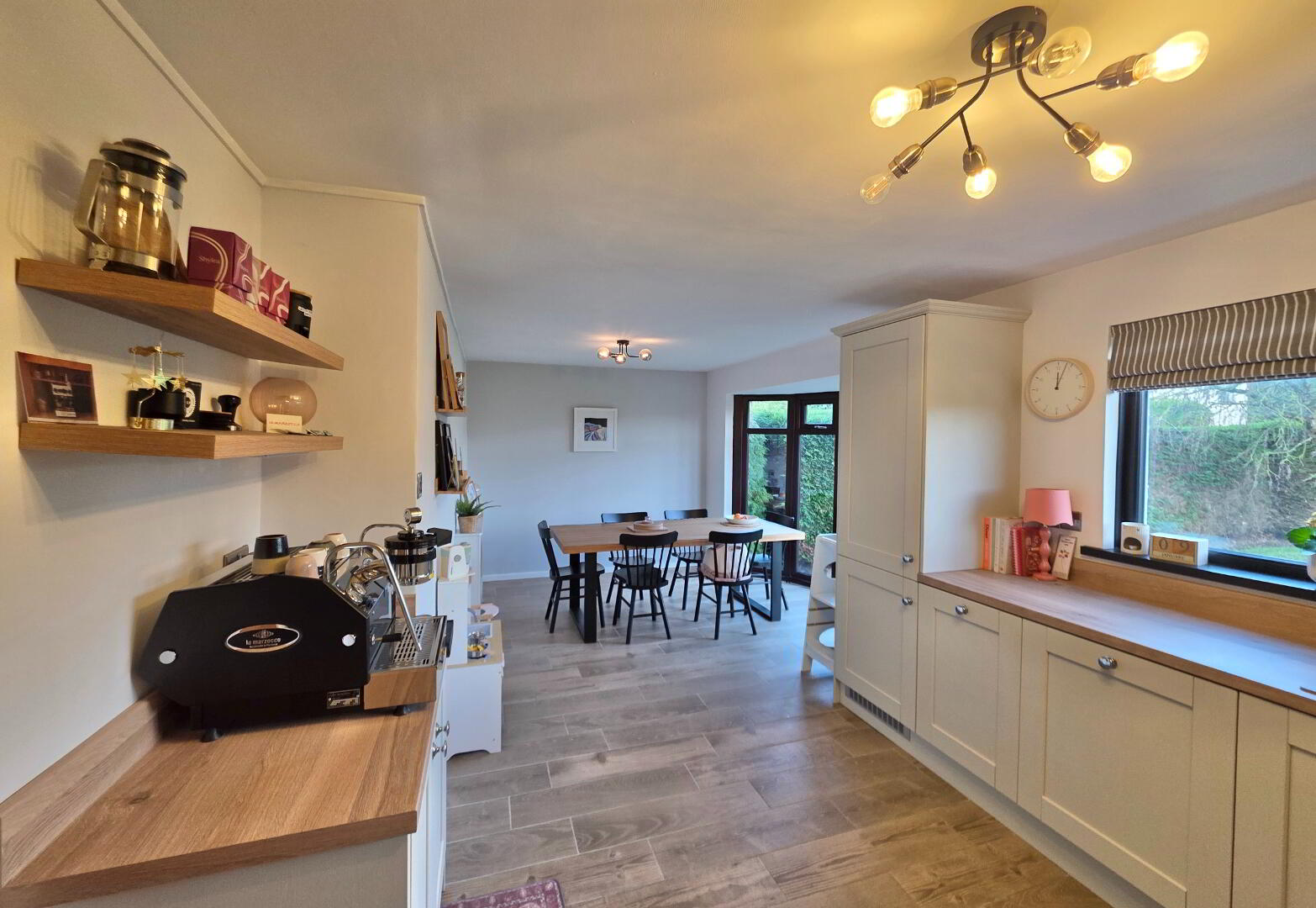 21'10 x 10'5 With 'Shaker' styled fully fitted eye and low level units finished with chrome door furniutre, incorporating 'Nordemende' induction ceramic hob with matching under oven, modern stainless steel extractor fan, 'Nordemende' integrated dishwasher, 'Nordemende' integrated fridge/freezer, integrated pull-out double bins, modern sink unit with mixer tap, saucepan drawers, tiled floor.