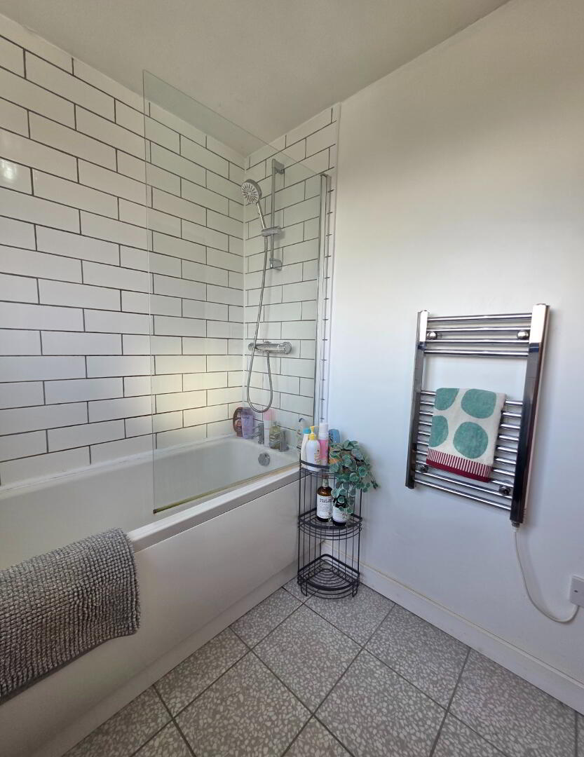 6'6' x 5'9 With white suite, shower over bath with 'Mira Atom' thermostatic controlled shower system complete with screen, fully tiled around bath, vanity unit.