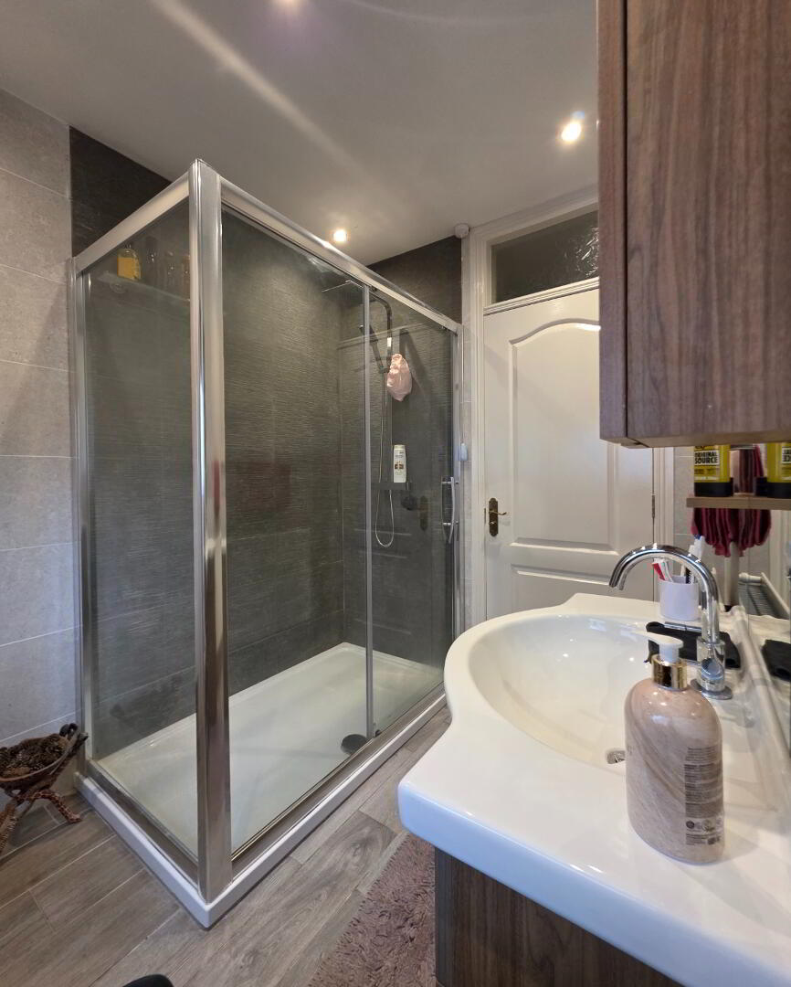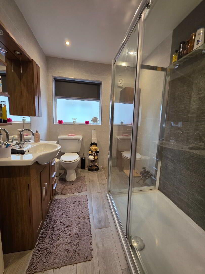 With fully tiled walk-in shower cubicle (5'0 x 2'10) with thermostatic shower system complete with drench head and body spray, oak vanity unit complete with mirror and bathroom cabinet, fully tiled walls, tiled floor, low voltage downlights, recessed lights.