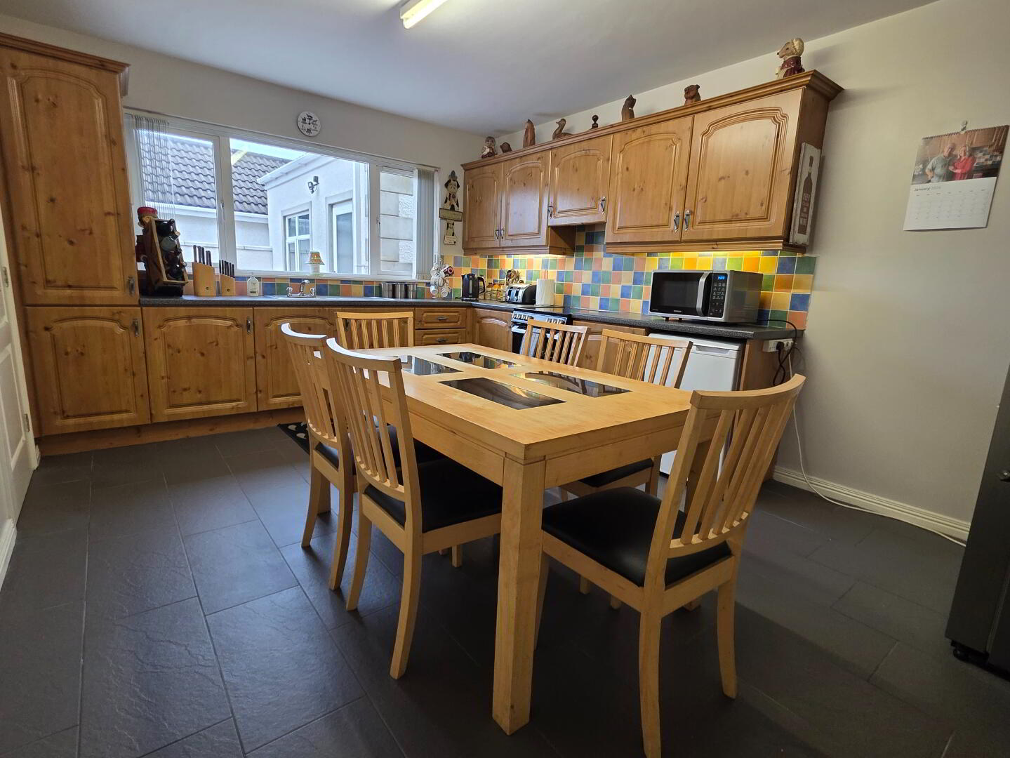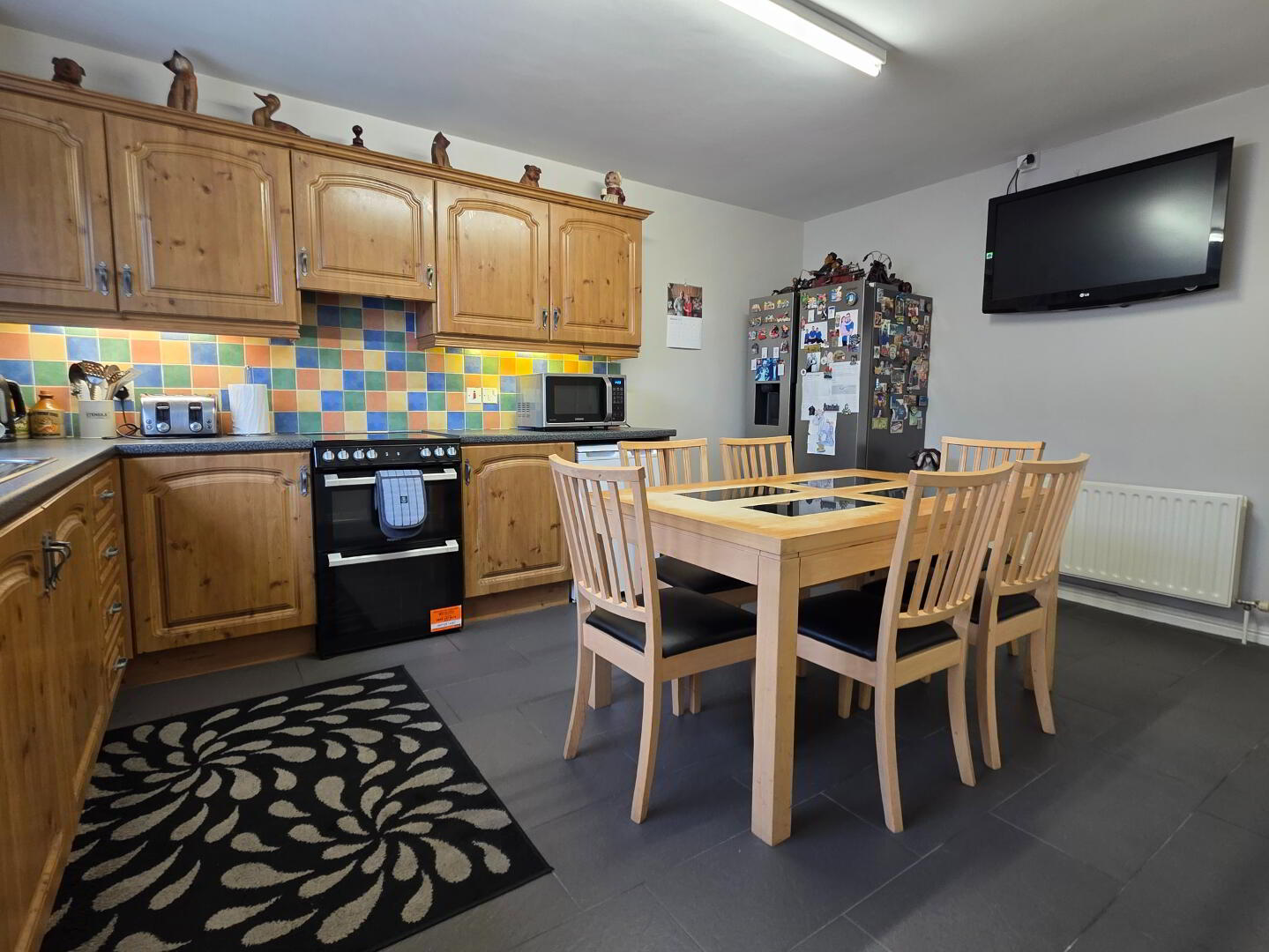 16'6 x 11'5 with an extensive range of fully fitted eye and low level units incorporating a single drainer stainless steel sink unit, space left for free standing cooker, extractor fan, tiled floor, tiled between eye and low level units, high level television point.