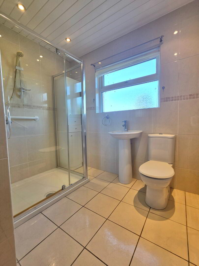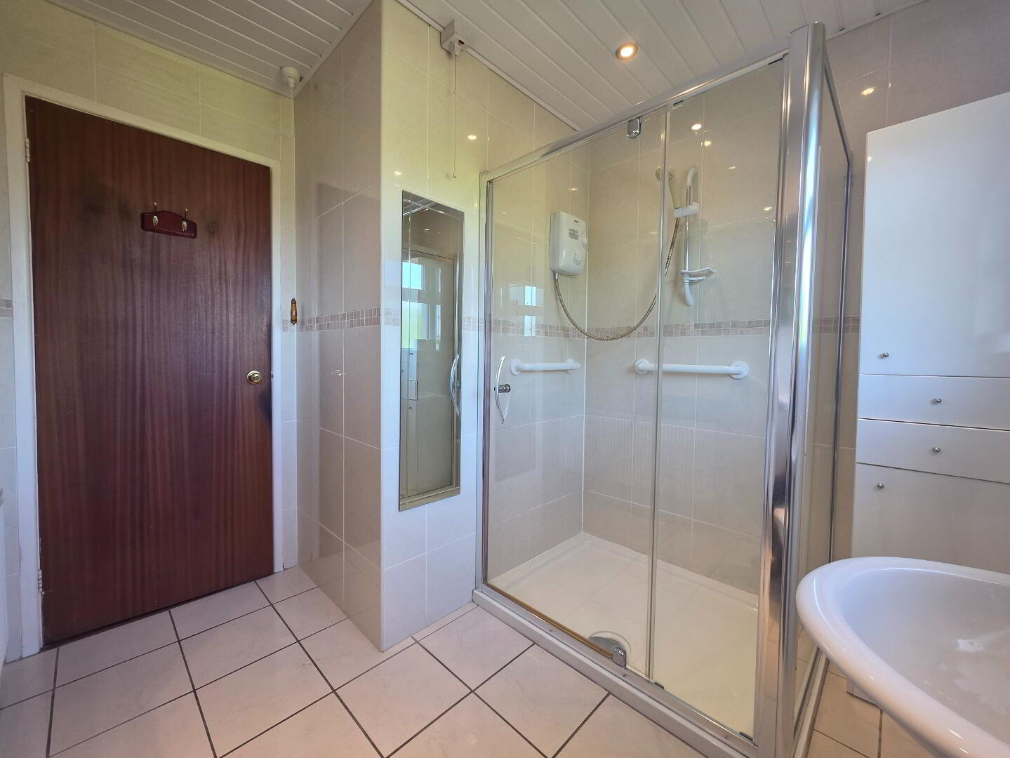 With fully tiled walk-in shower cubicle having 'Redring' electric shower system, w.c. and wash hand basin, tiled floor, fully tiled walls.