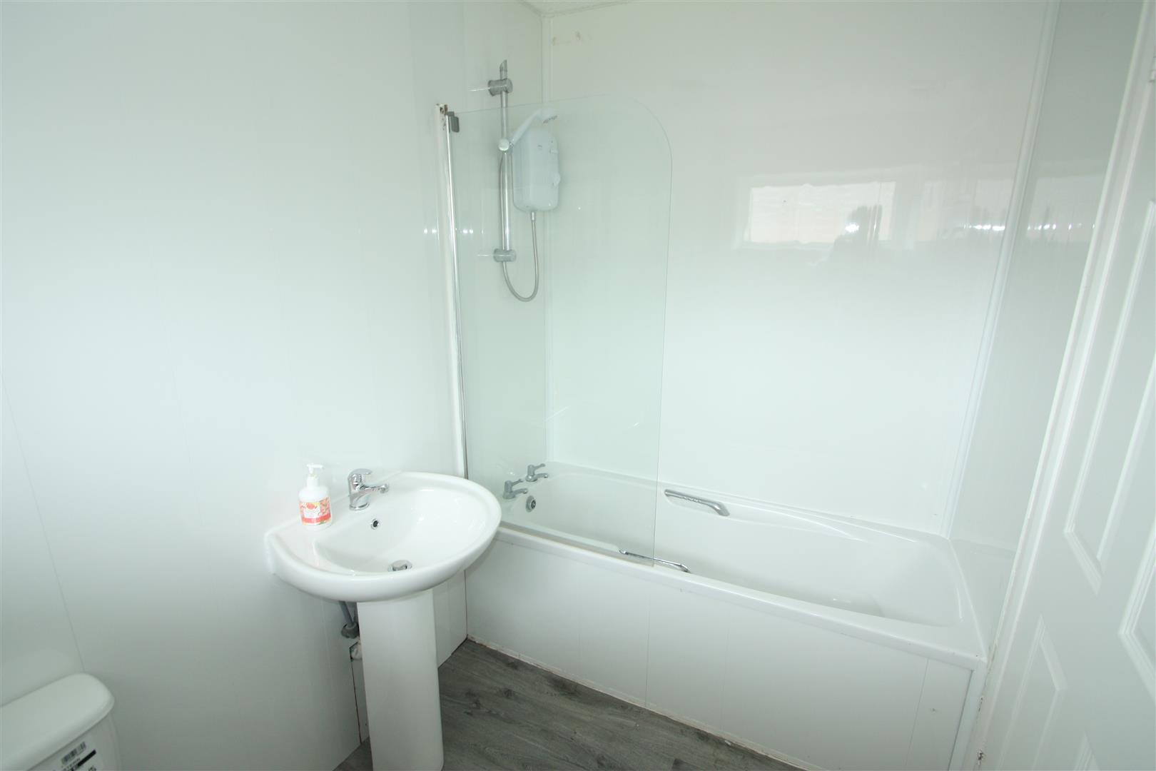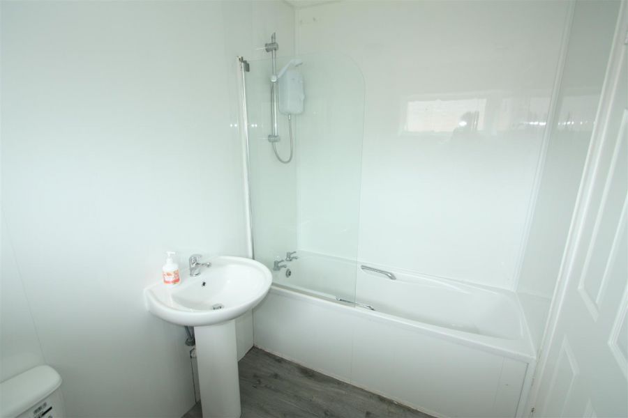 White suite comprising low flush w.c, wash hand basin and panel bath with overhead shower.