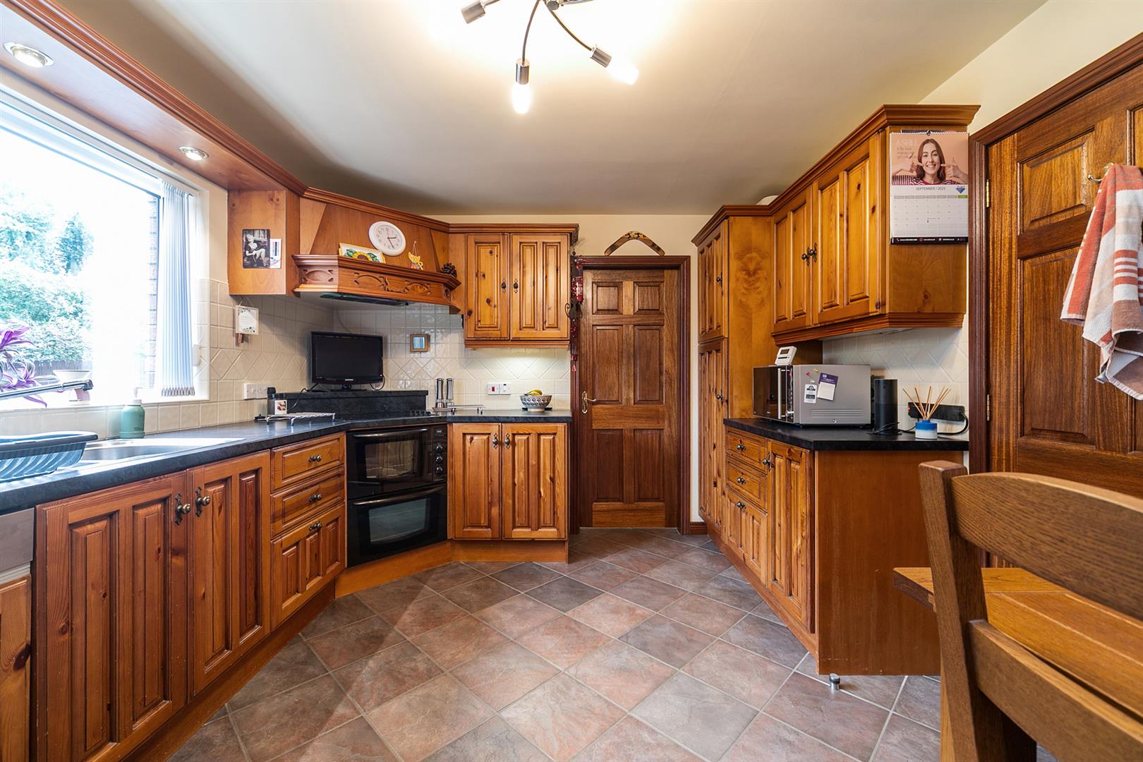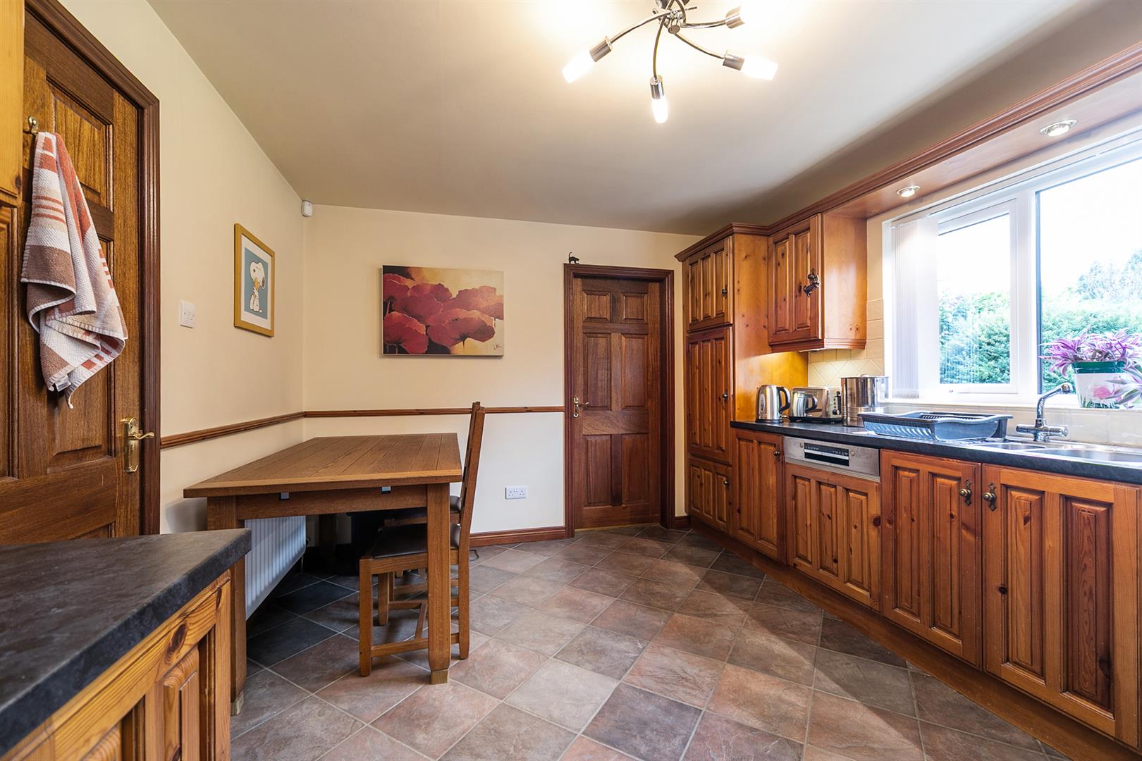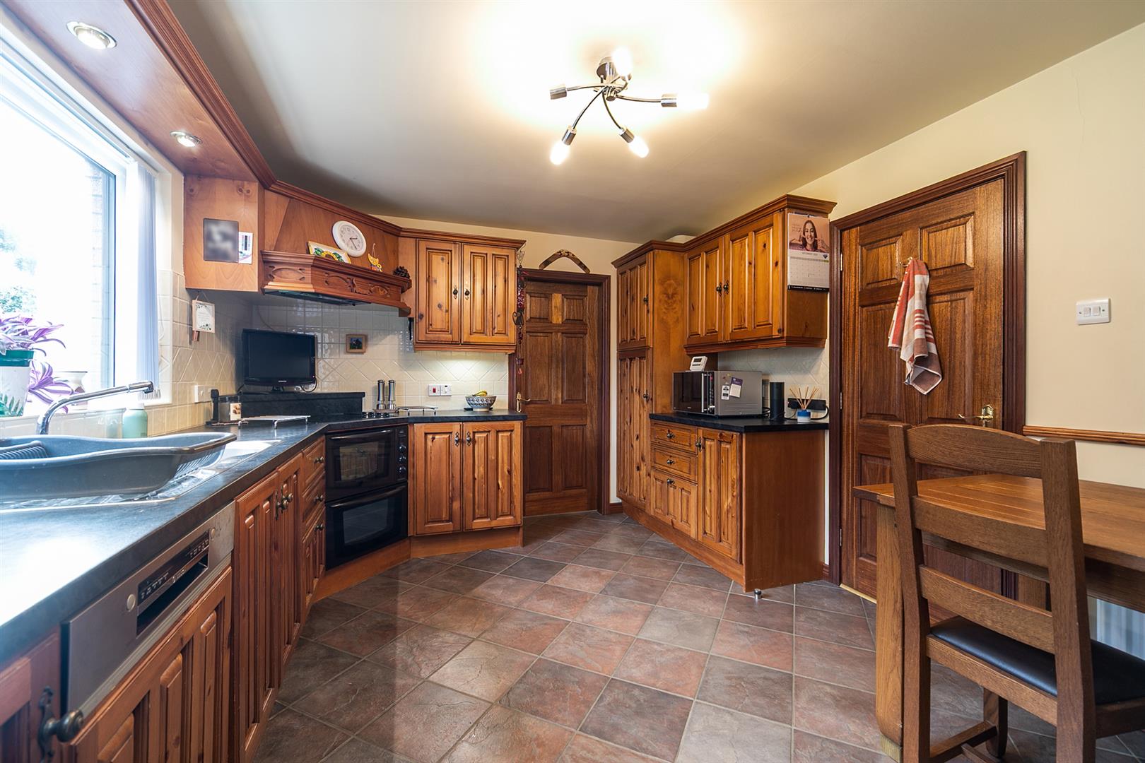 Solid wooden kitchen with a range of high and low rise units with integrated stainless steel sink and drainer and tiled splash backs. Double electric oven and hob with overhead extractor fan. Integrated dish washer. Space for dining. Tiled floor. Door to utility.