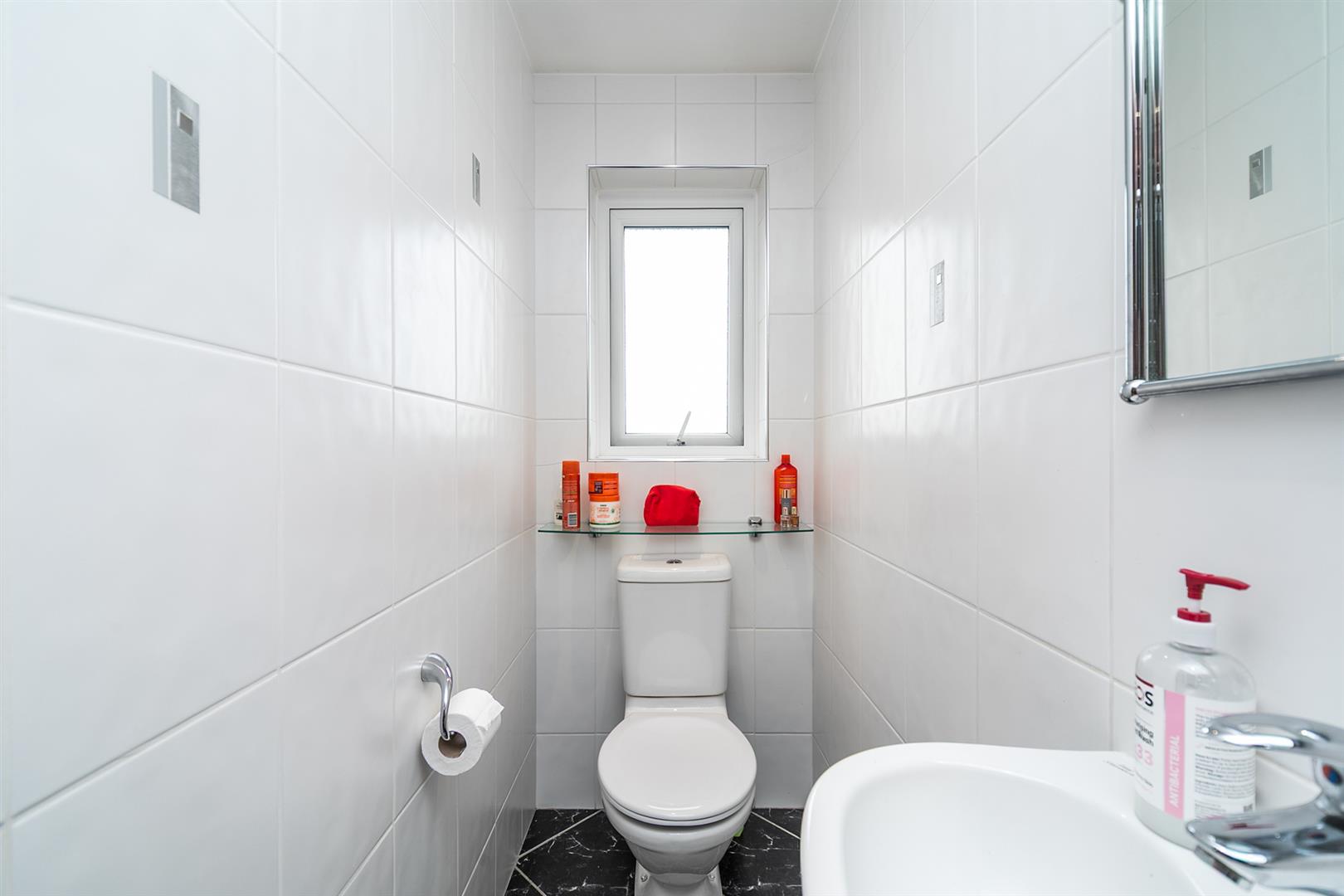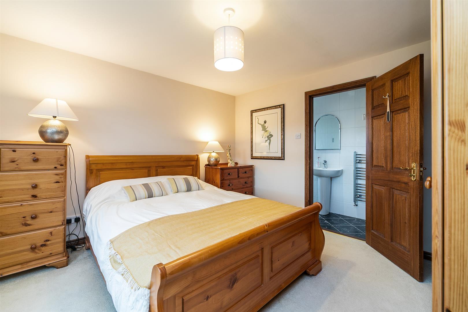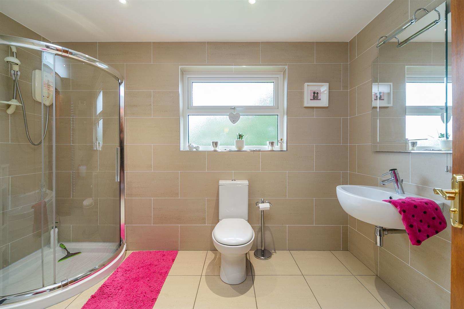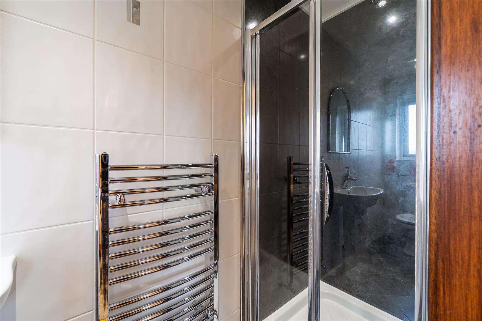 White suite encompassing low flush W/C, wash hand basin and shower. Towel radiator. Fully tiled walls and floor.