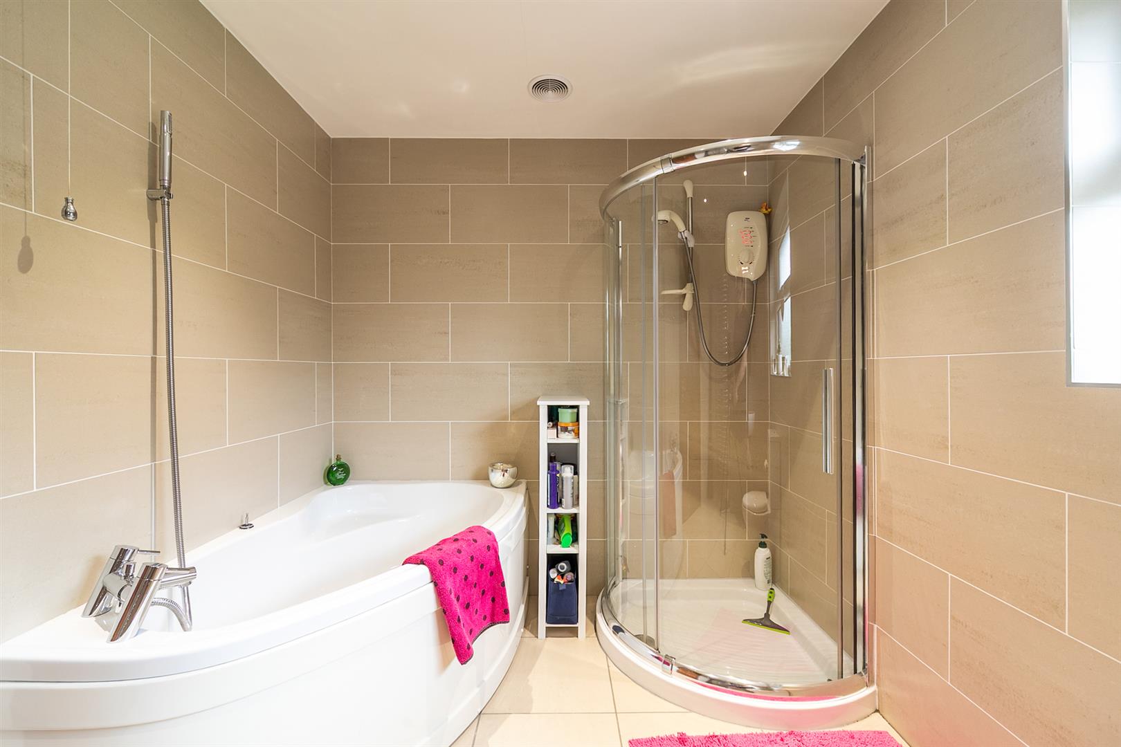 White suite encompassing low flush w/c, wash hand basin, bath with shower attachment and separate corner shower. Fully tiled walls and floor.