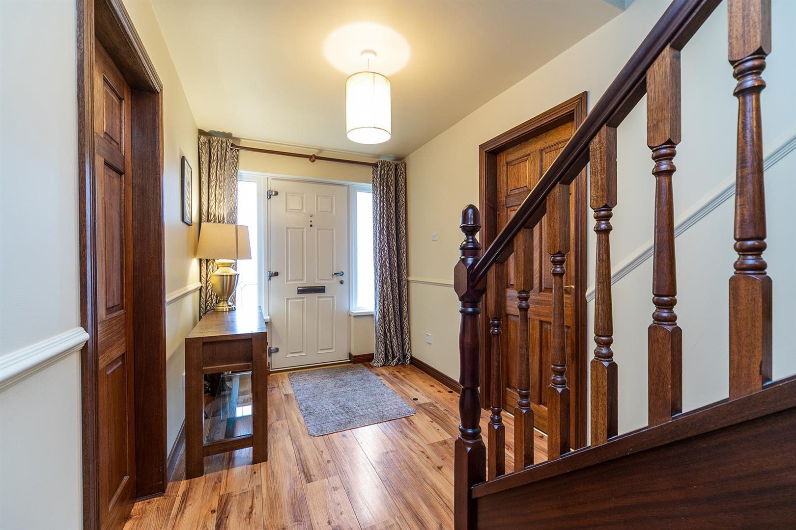 Composite front door and side panel windows into spacious entrance hall with solid wooden flooring. Access to under stair storage cupboard.