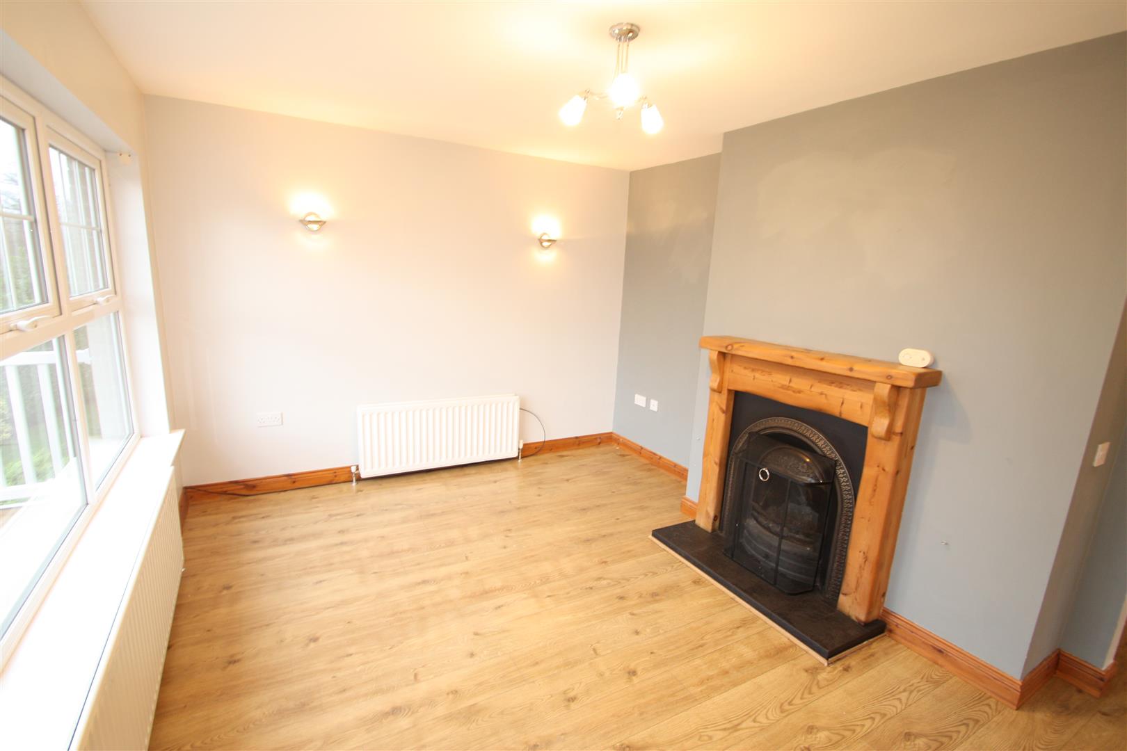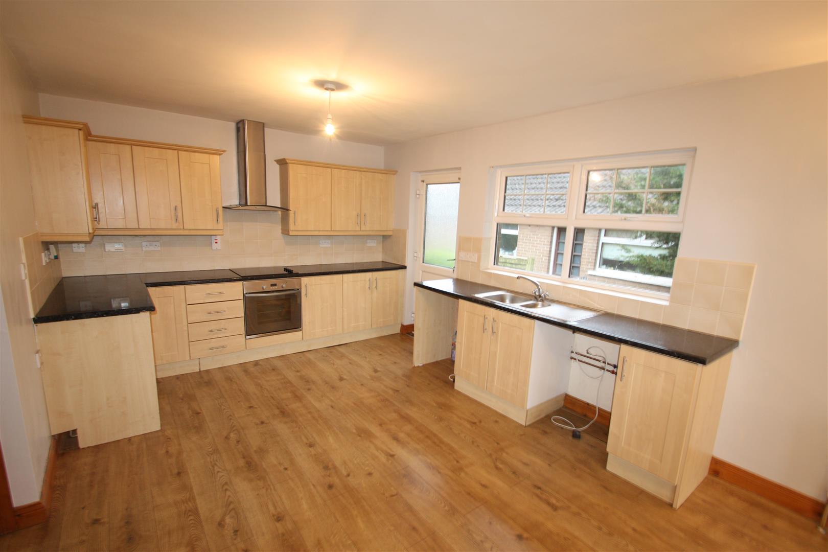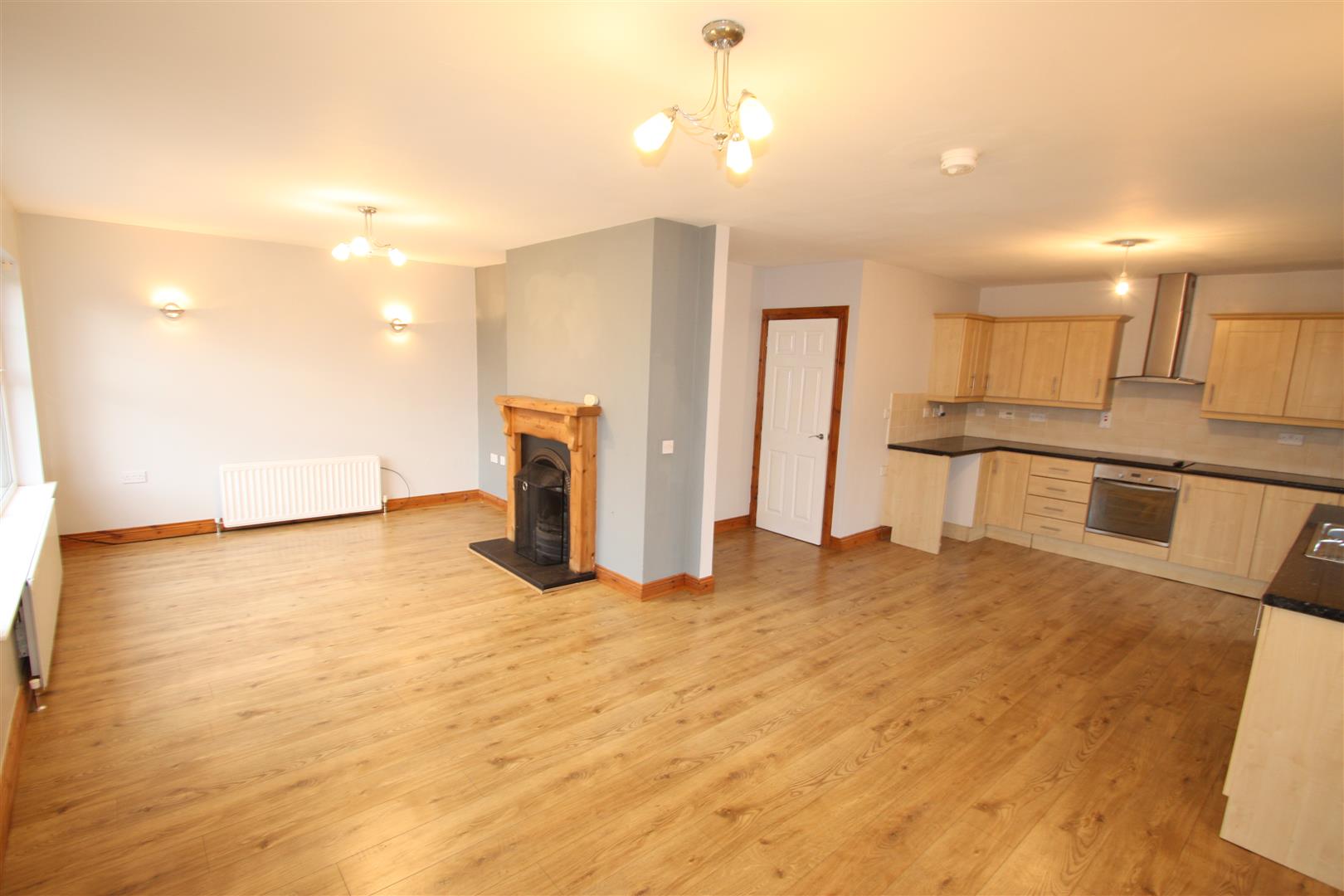 A range of high and low level units including stainless steel sink unit with single drainer and tiled splash backs. Integrated oven and hob with extractor fan, recess for fridge freezer, washing machine and tumble dryer. Door to side. Wooden laminate flooring. Fireplace with wooden surround, decorative inset and slate hearth. Double doors leading onto raised decked area with views over the countryside.