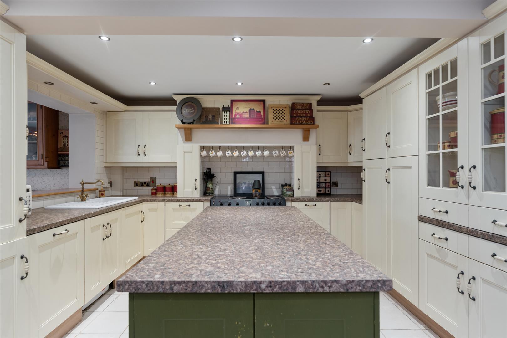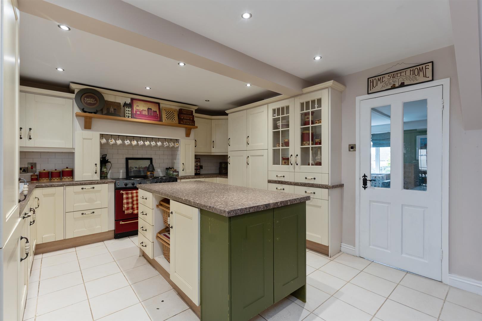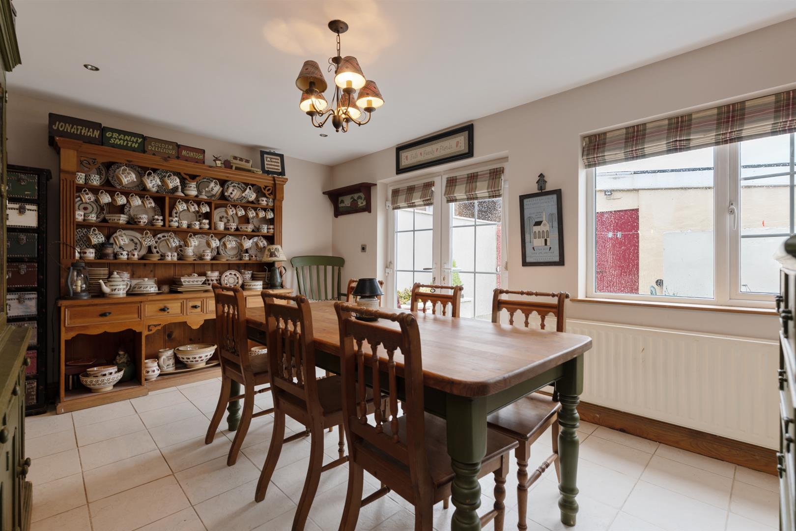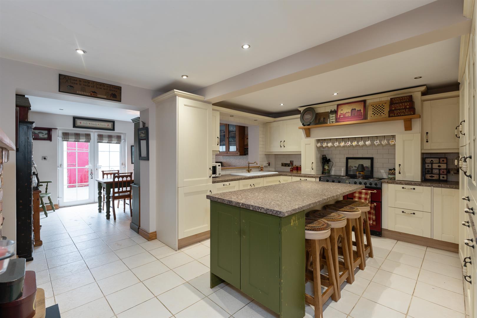 A range of high and low level units including sink unit, space for range style cooker, recess for washing machine, integrated fridge freezer, island unit. Tiled floor and splash area. Open plan through to dining area: