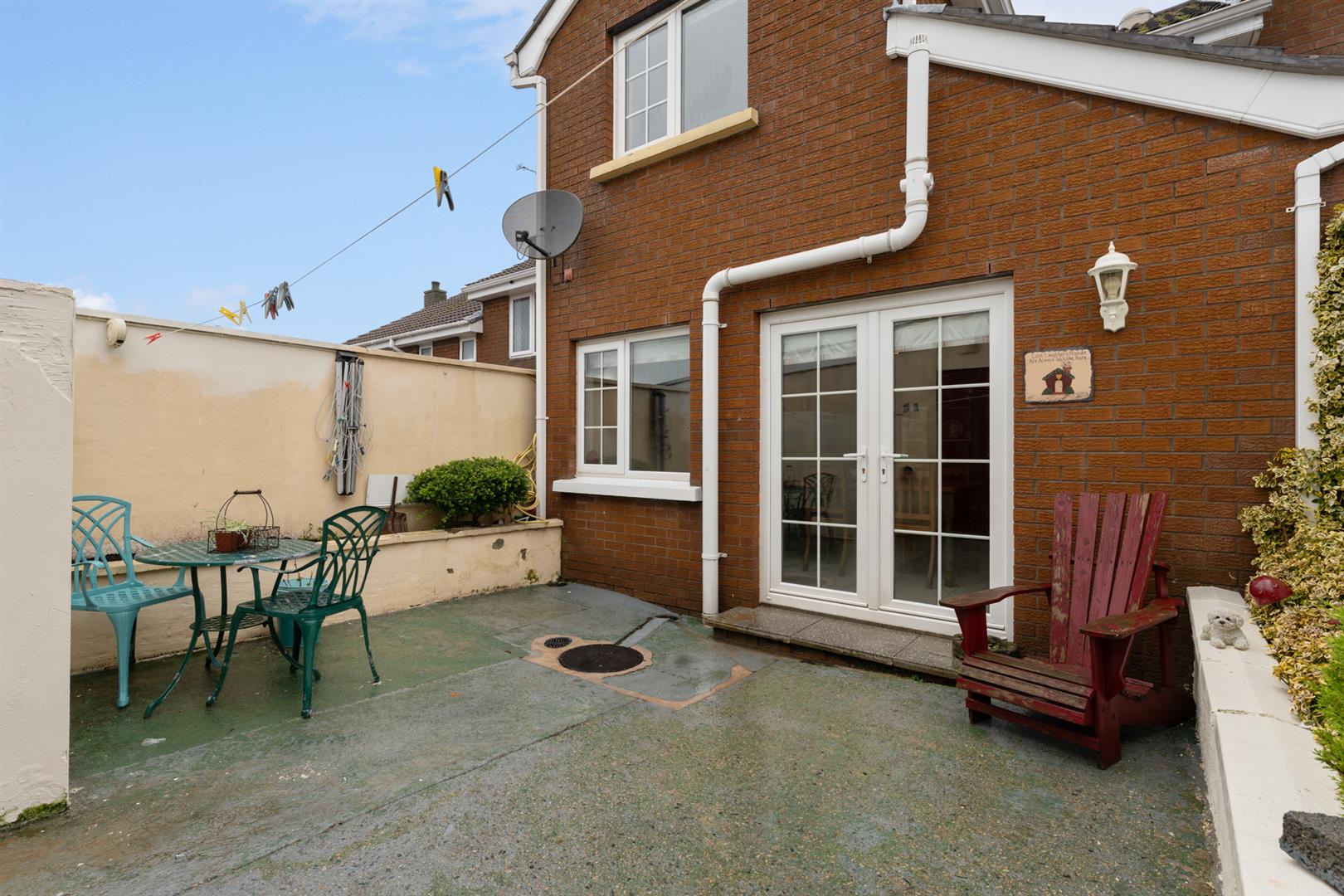 To the front is an enclosed stoned garden with mature plantings and a paved area. To the rear is an enclosed yard with access to garage.