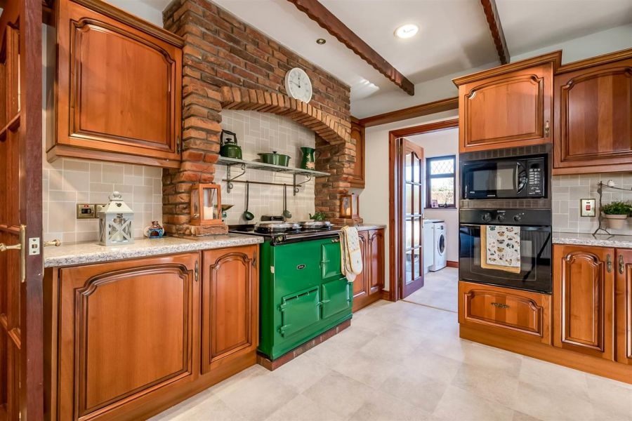 Range of high and low level units, Aga, four ring gas hob with extractor above, single drainer sink unit, plumbed for washing machine, bay window.