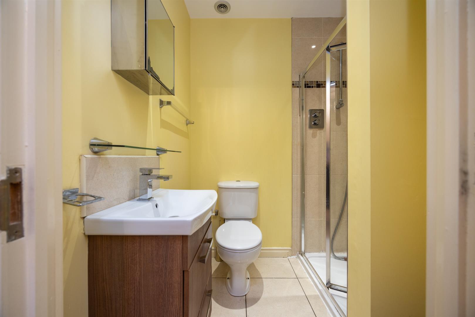 White suite encompassing low flush W/C, vanity wash hand unit and shower. Tiled floor and part tiled walls.
