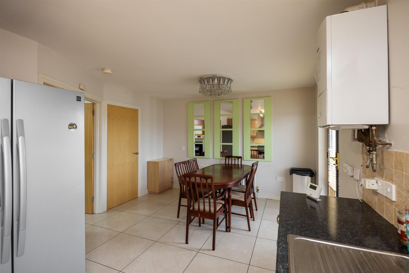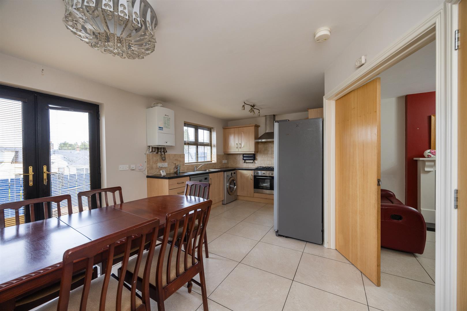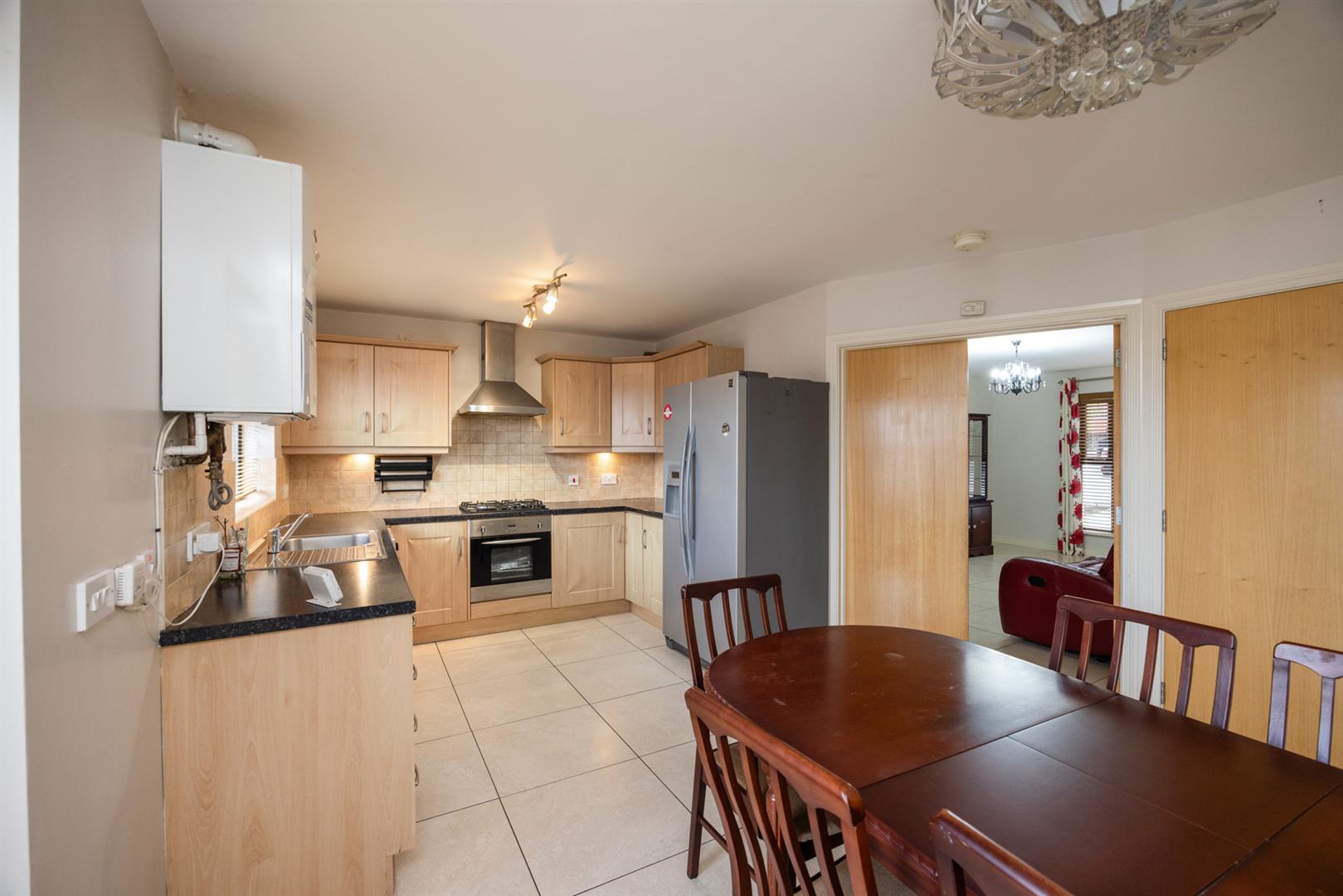 Range of high and low rise units with stainless steel sink and drainer. Gas hob with overhead stainless steel extractor fan and electric oven. Recess for American style fridge/freezer; washing machine and dish washer. Tiled Floor. Double patio doors with access to rear.