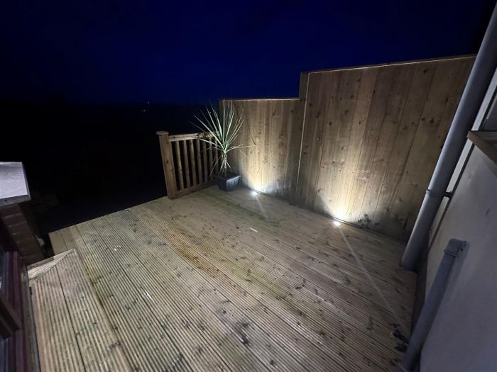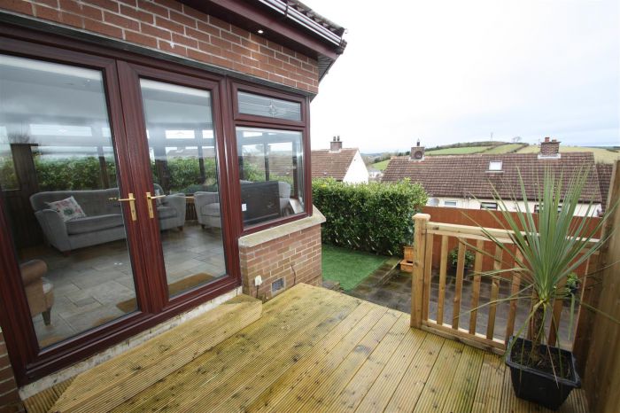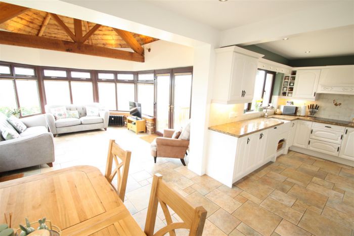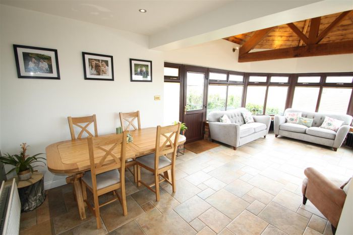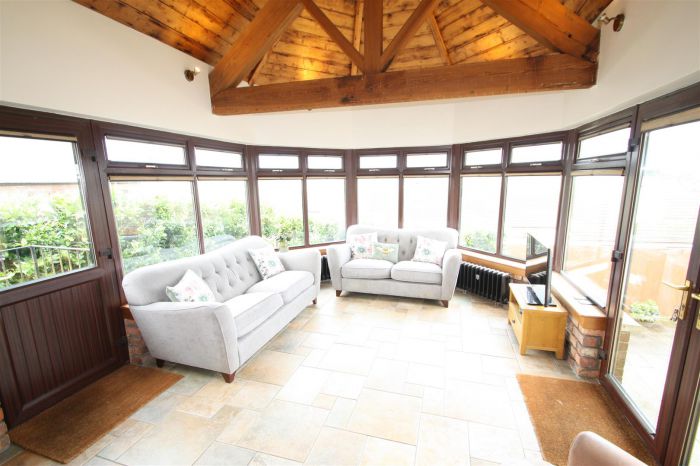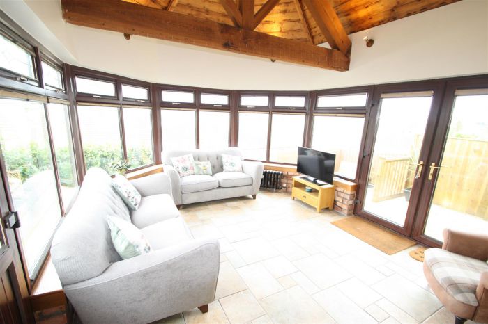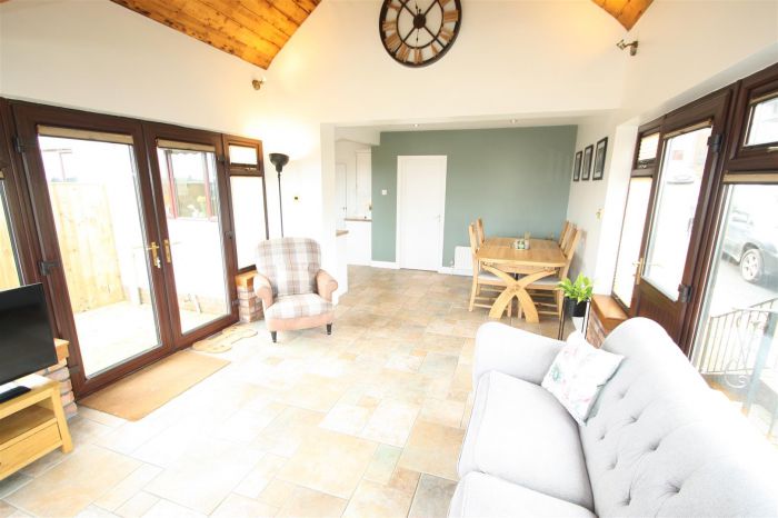 Fantastic spacious sun room with feature Belfast brick walls and reclaimed beams into vaulted ceiling. Tiled flooring. Door to side and decking area.