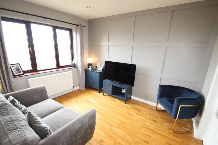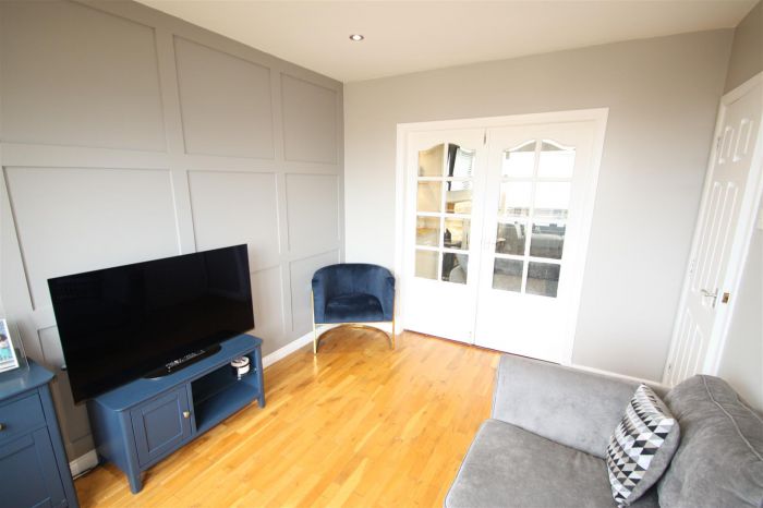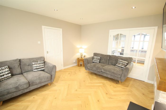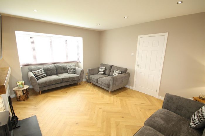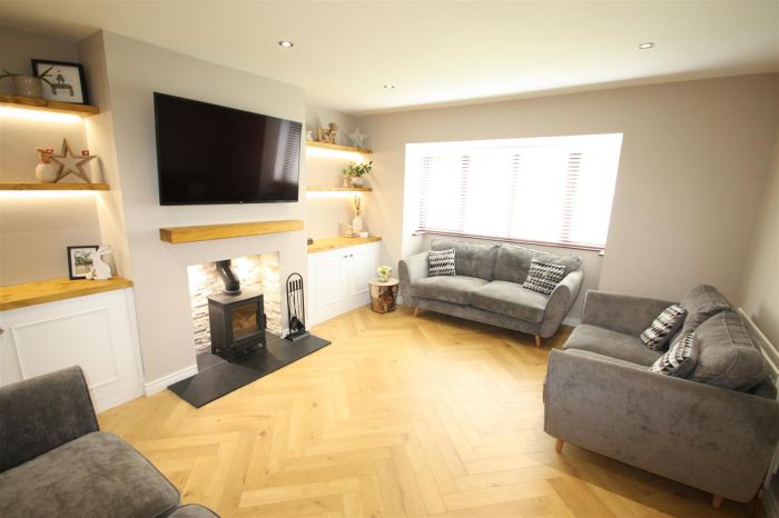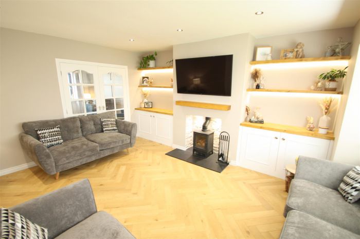 Large bright living room with wooden parquet style flooring. Fireplace with wood burning stove, tiled inset, slate hearth and feature wood mantle. Bay window. Built in storage units and shelving. Double doors leading to sitting room.