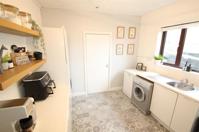 Range of high and low rise units with stainless steel sink and drainer. Recess for washing machine and tumble dryer. Feature tiled floor. Door to garage.
