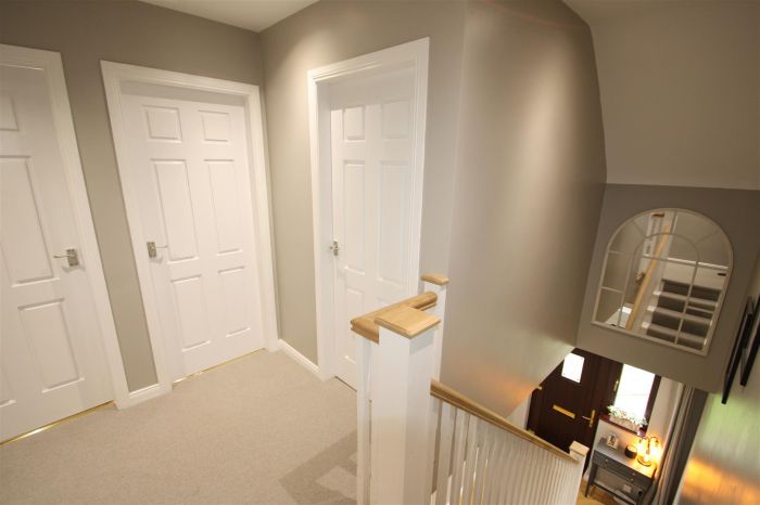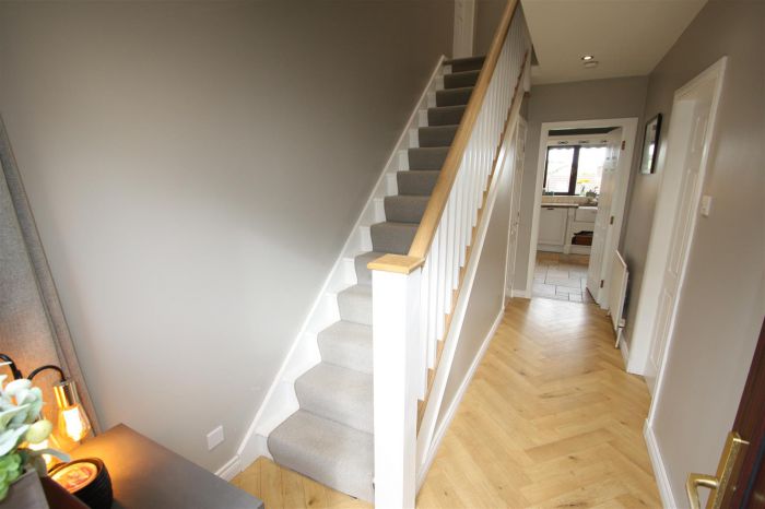 PVC glazed front door leading into bright and spacious entrance hall with solid wooden parquet style flooring.
