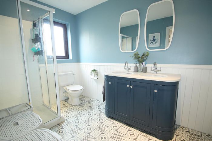 White suite comprising shower, double sink vanity unit and low flush wc. Feature tiled floor and wood panelled walls.