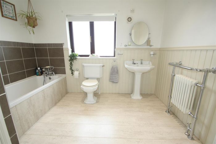 White suite comprising panelled bath with telephone shower attachment, low flush wc and wash hand basin. Laminate flooring, walls tiled to splash, tongue and groove wall panelling. Heated towel rail, hotpress.