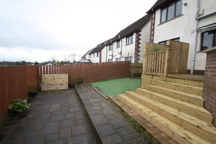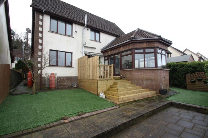 To the rear is a raised decked area and patio area. Various mature plantings and pebbled beds.