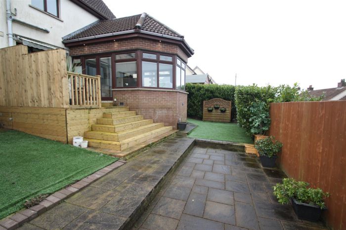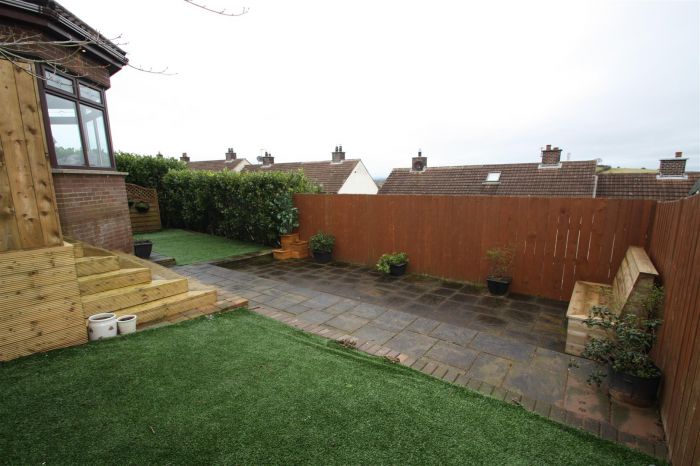 Well presented gardens to the front laid out in lawn with brick paved driveway and plantings.