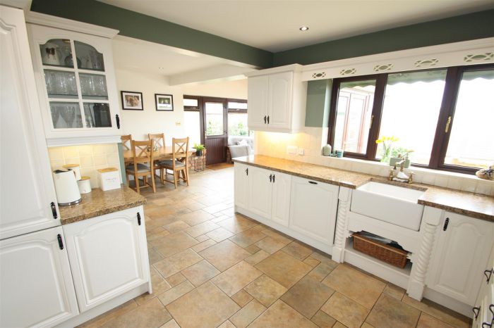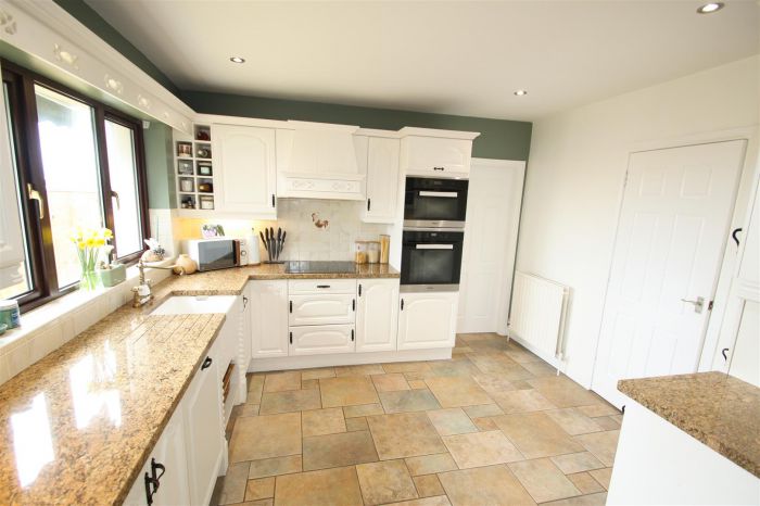 Range of high and low level units incorporating granite worktops, integrated oven and gas hob, electric extractor fan, integrated dishwasher, integrated microwave, Belfast sink, glazed display units and an integrated wine rack. Tiled flooring and wall tiling to splash.
