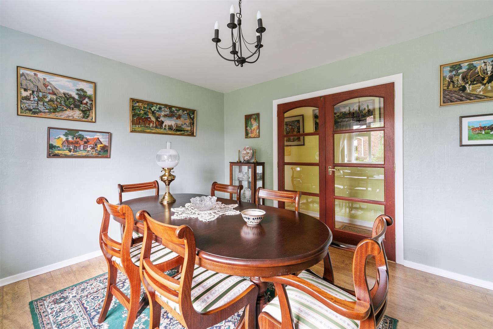 French doors to dining room with solid wood flooring.