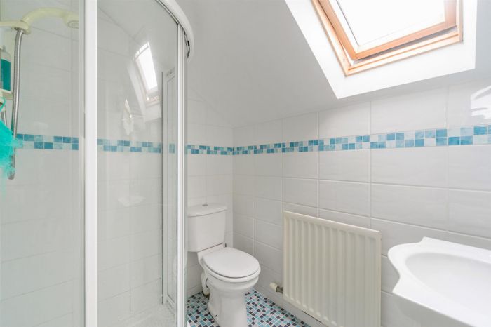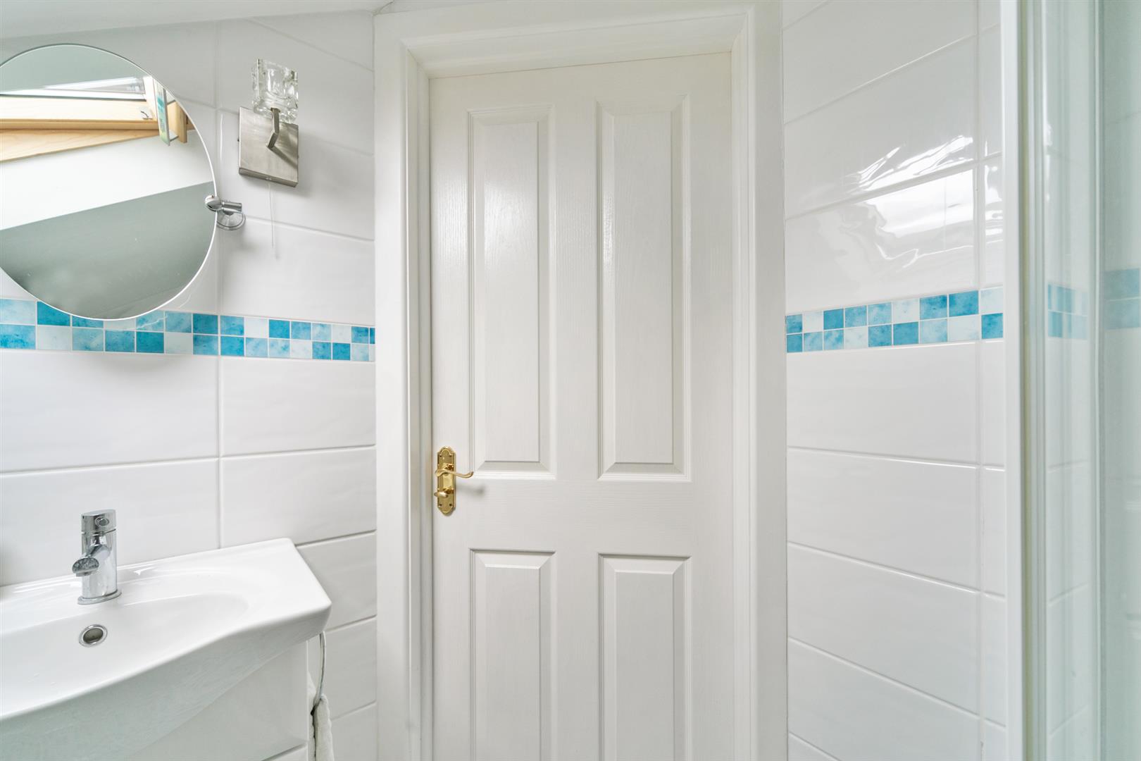 White suite comprising low flush w.c, wash hand basin and shower cubicle. Tiled walls.