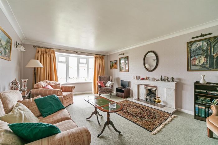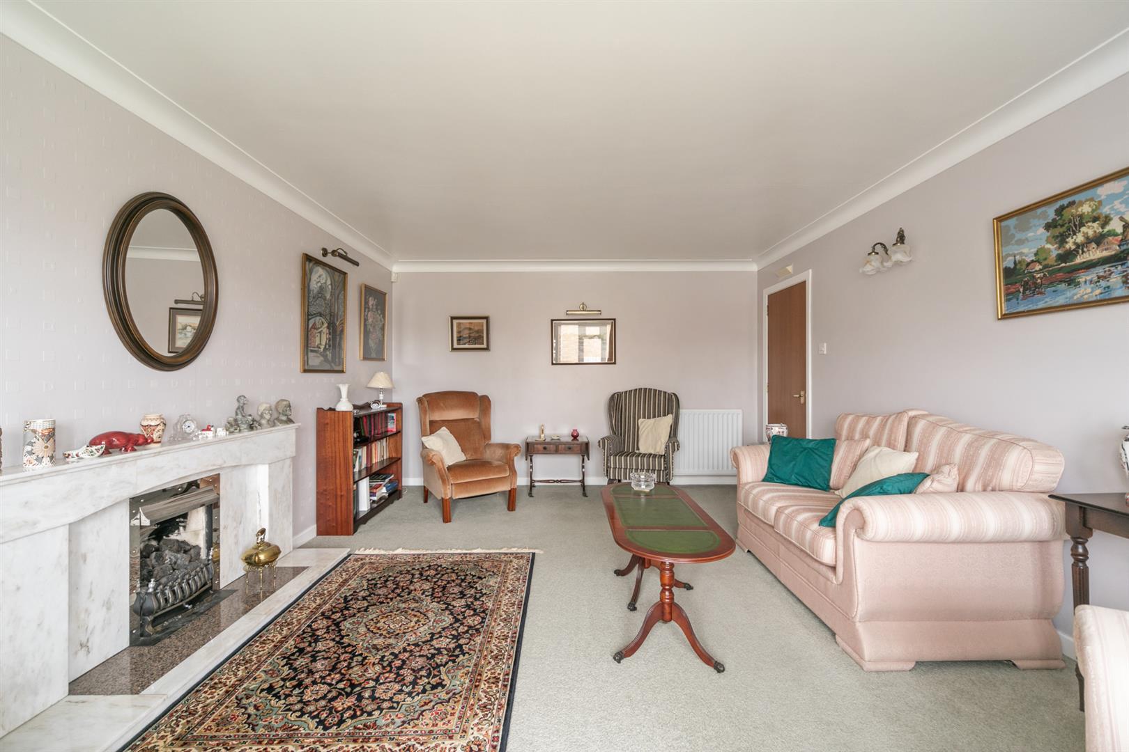 Large spacious living room with bay window and cornicing. Feature fireplace with gas fire and marble surround.